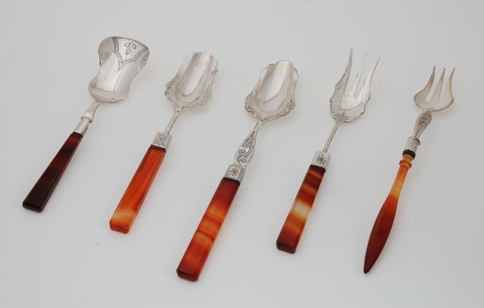 Twee vorkjes en drie schepjes met oranje-rode handva...