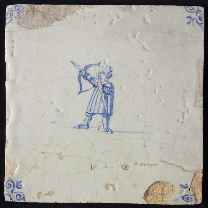 Figuurtegel, krijgsman met pijl en boog, hoekmotief ...