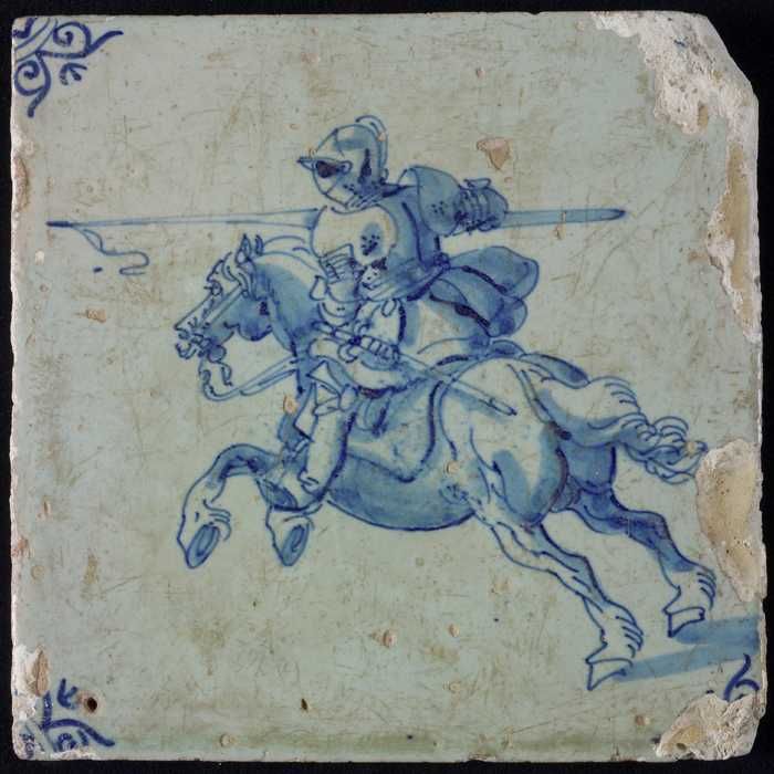 Figuurtegel, ruiter in harnas, hoekmotief ossenkop
