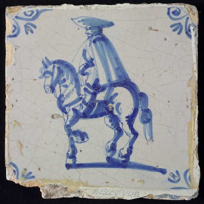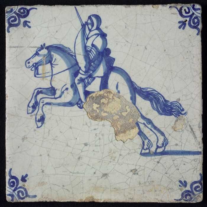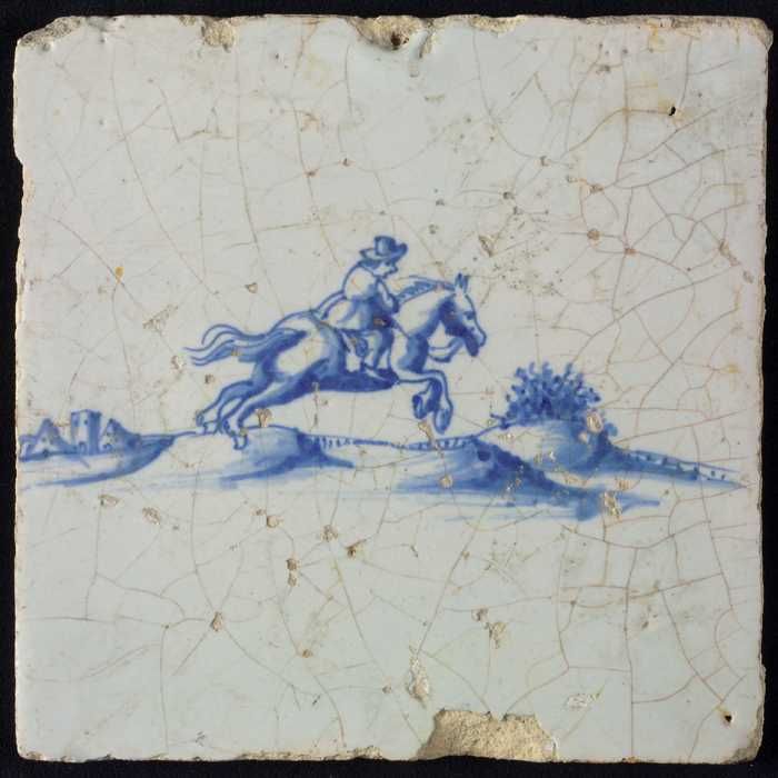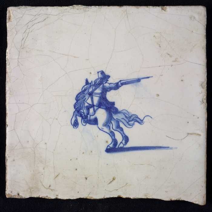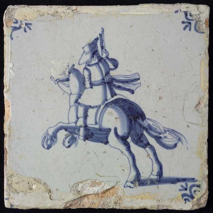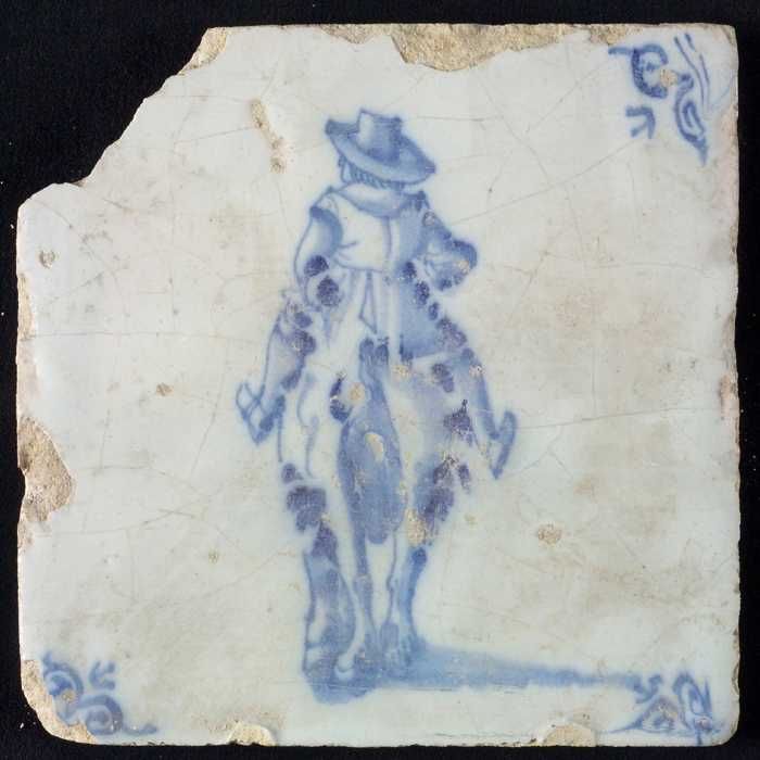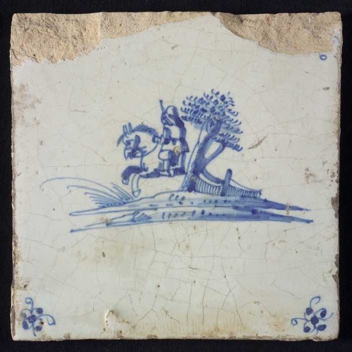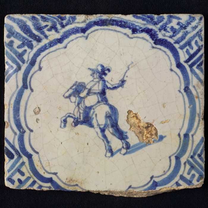 Figuurtegel, ruiter met pistool (?), hoekmotief osse...