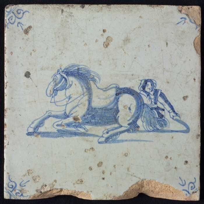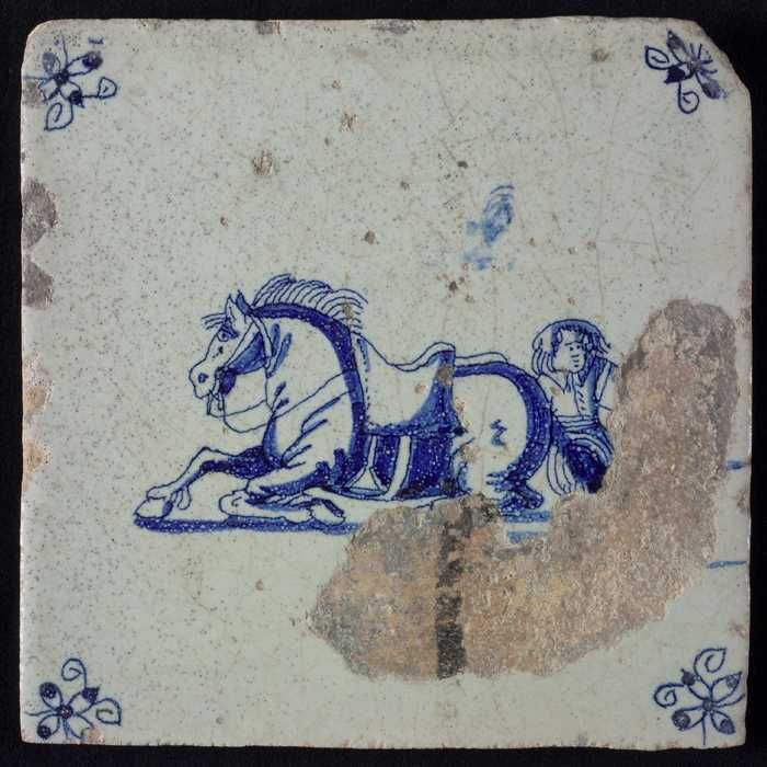 Figuurtegel, ruiter, liggend paard, hoekmotief ossenkop