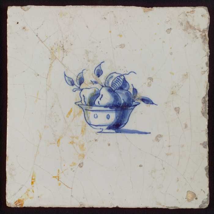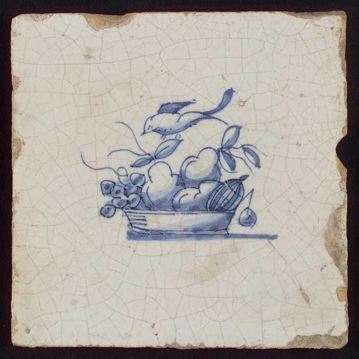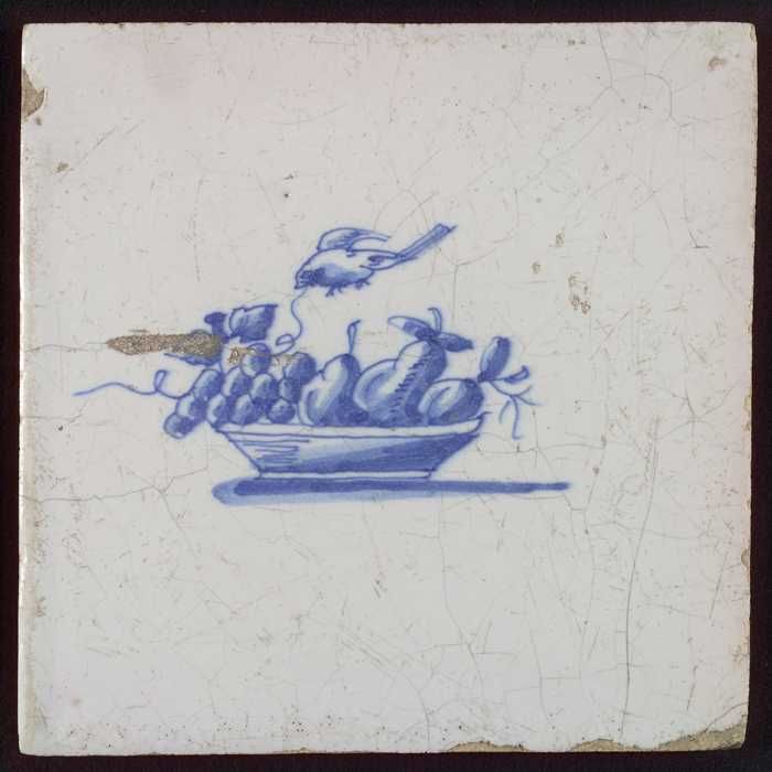 Witte tegel met blauwe fruitmand met druiven en vogel