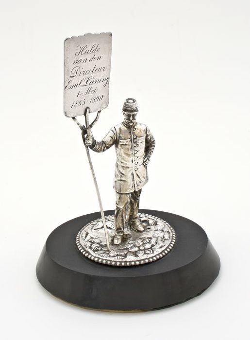 Zilveren mansfiguur op houten standaard, met vaandel...