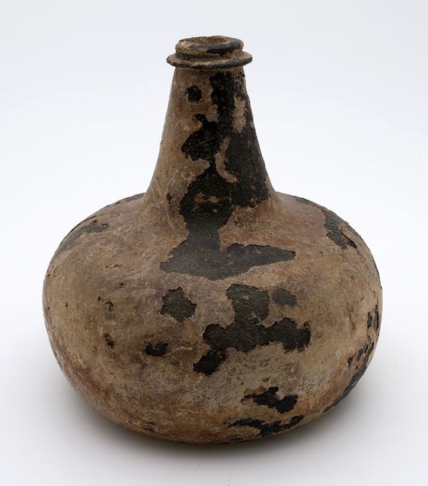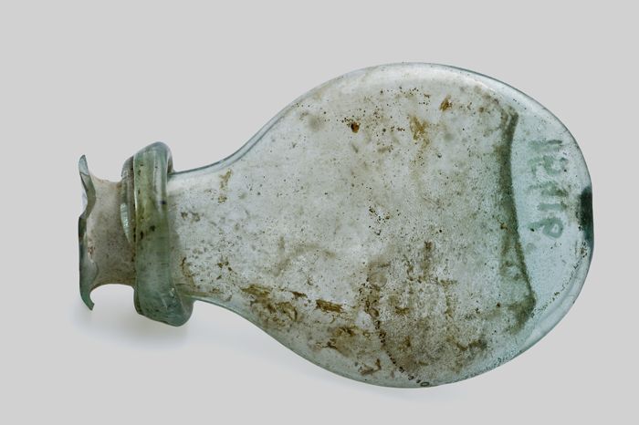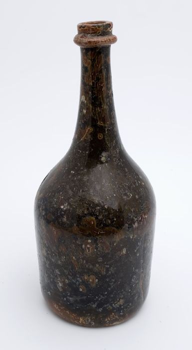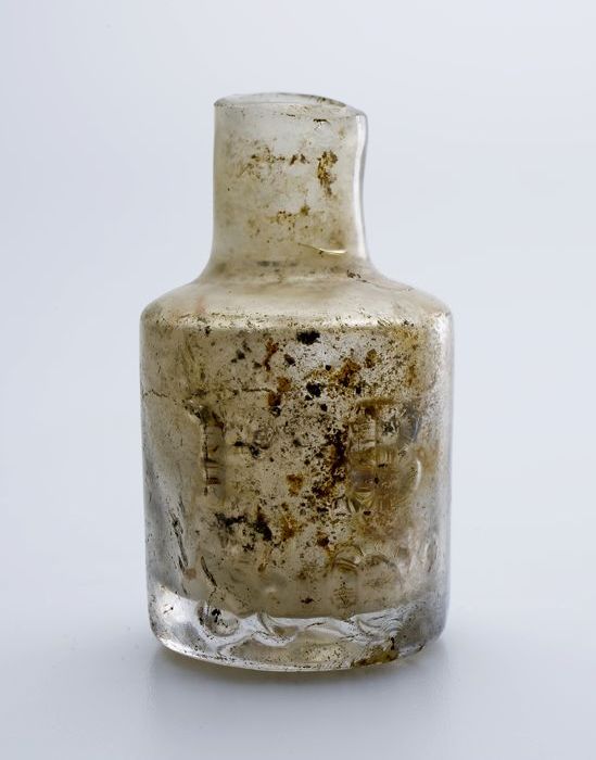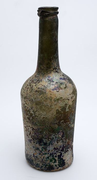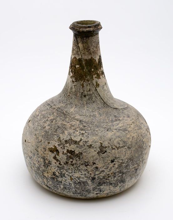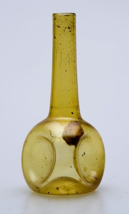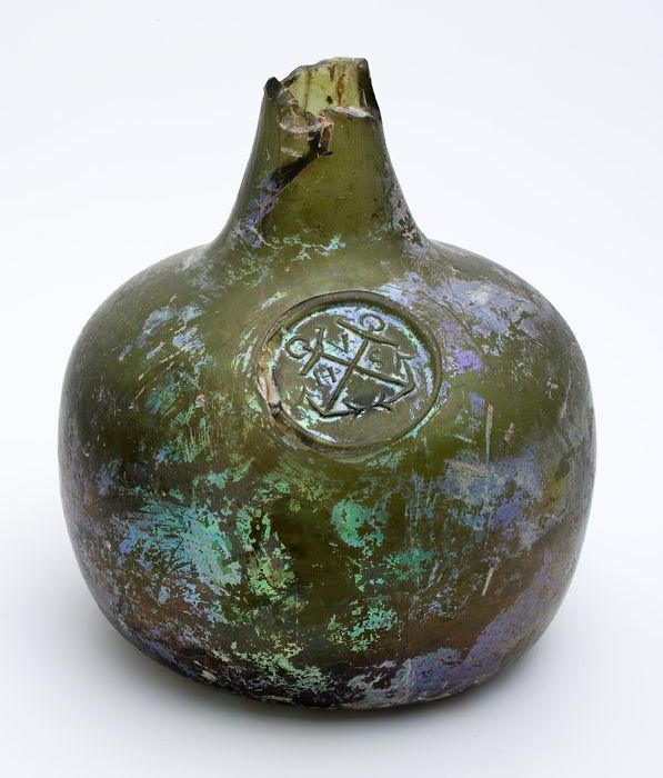 Buikfles met glaszegel op de schouder, waarin twee g...
