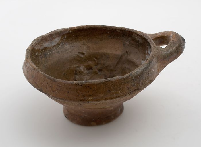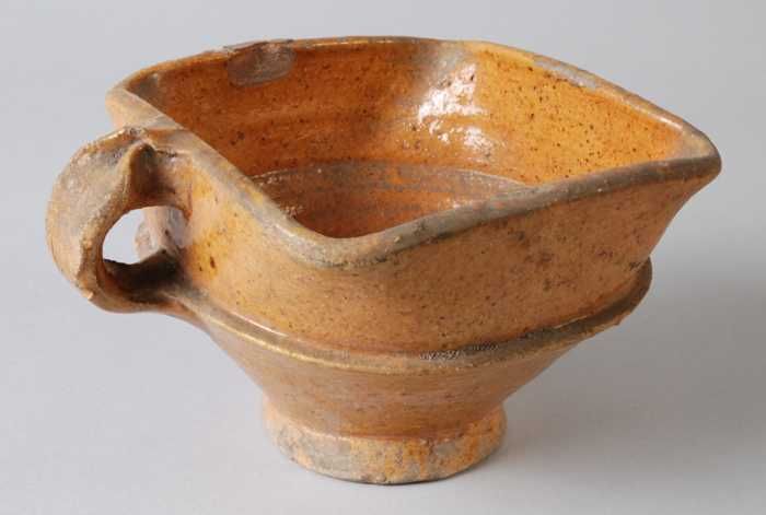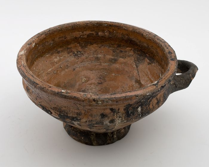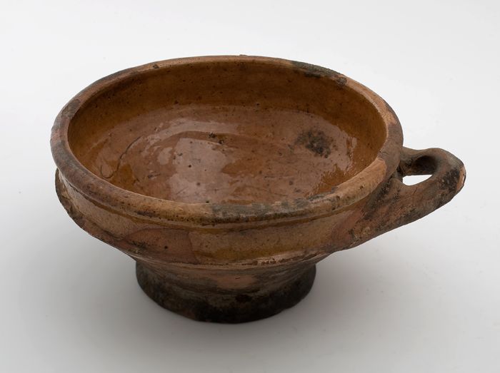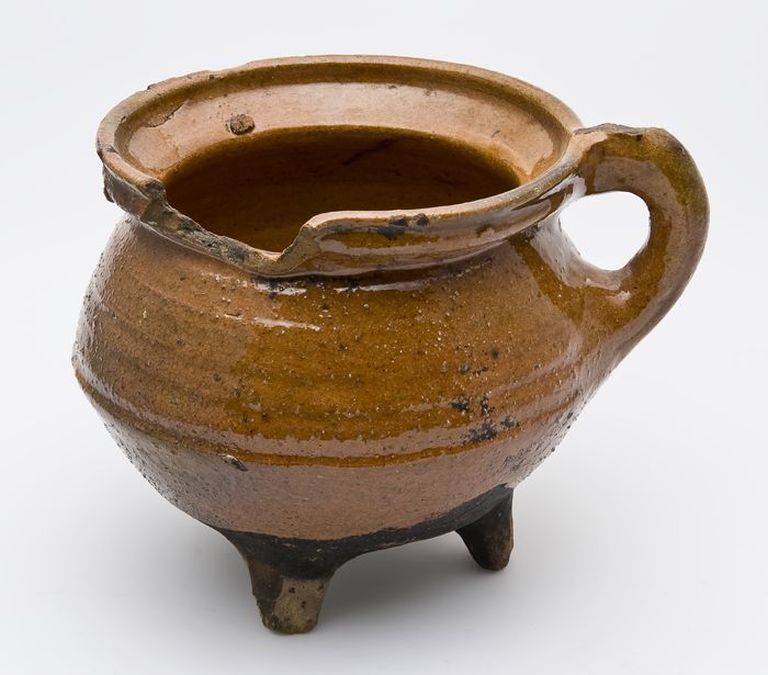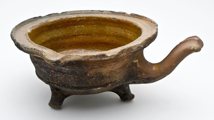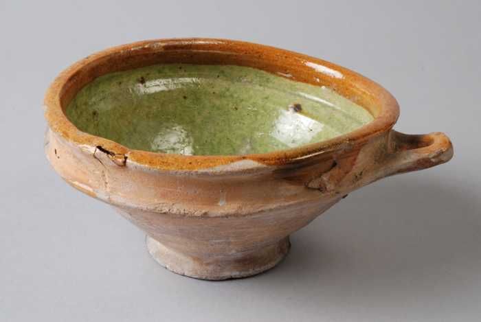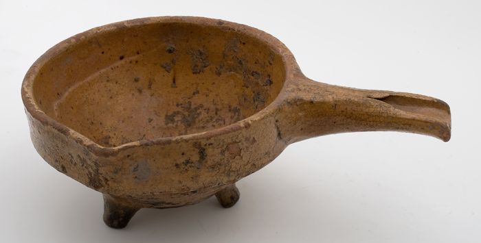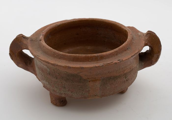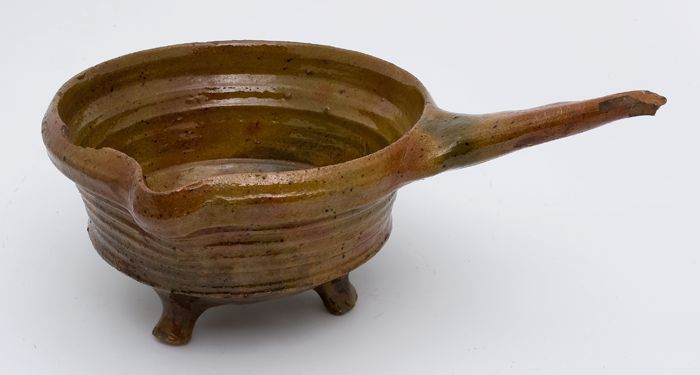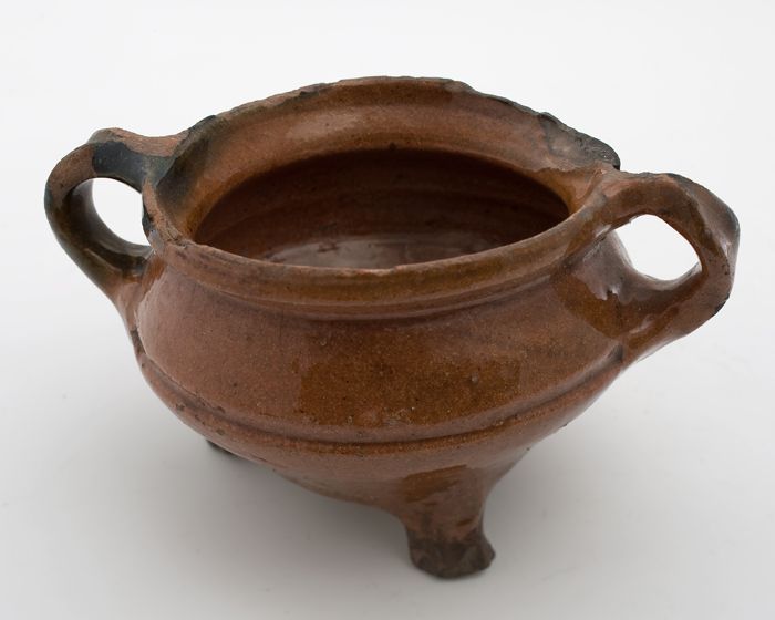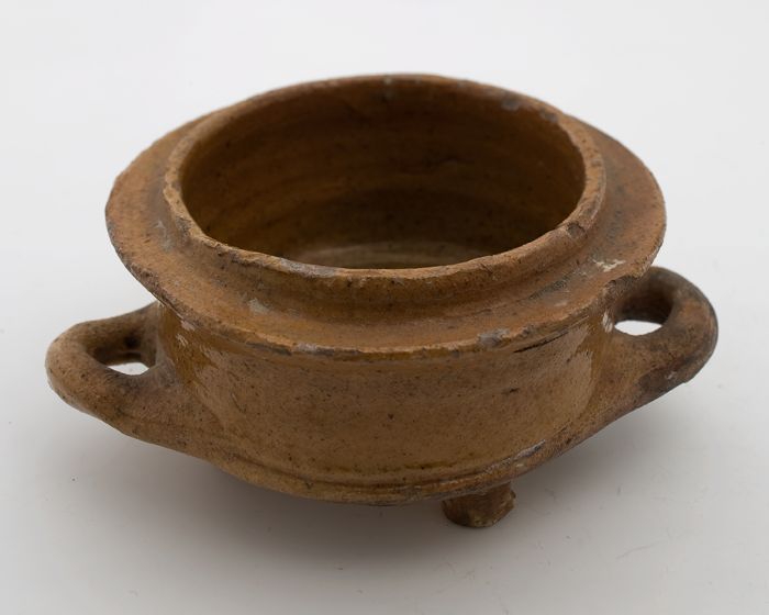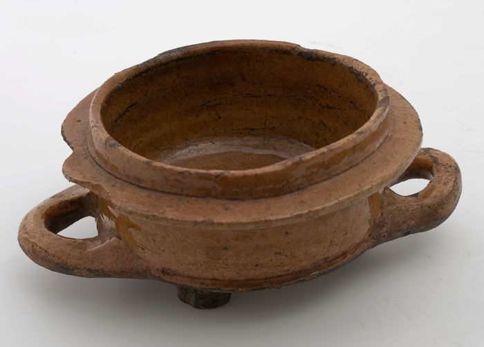 Aardewerk steelpan op drie poten, komvormig met sche...