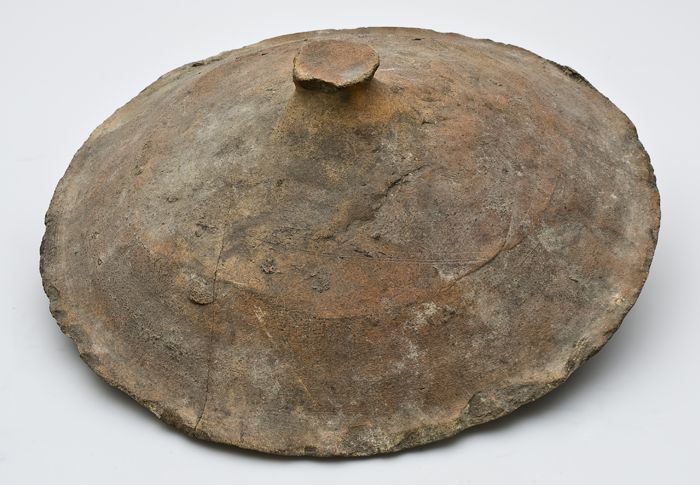 Aardewerk deksel met kleine knop in het midden, onge...
