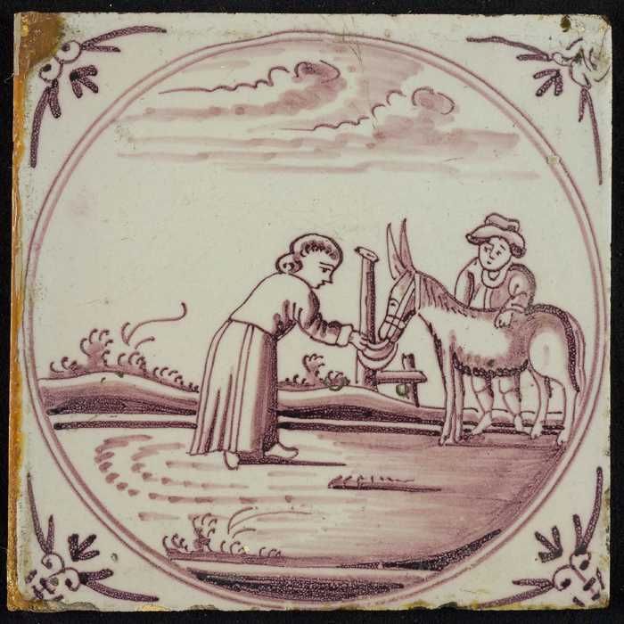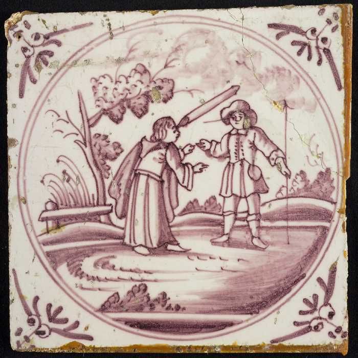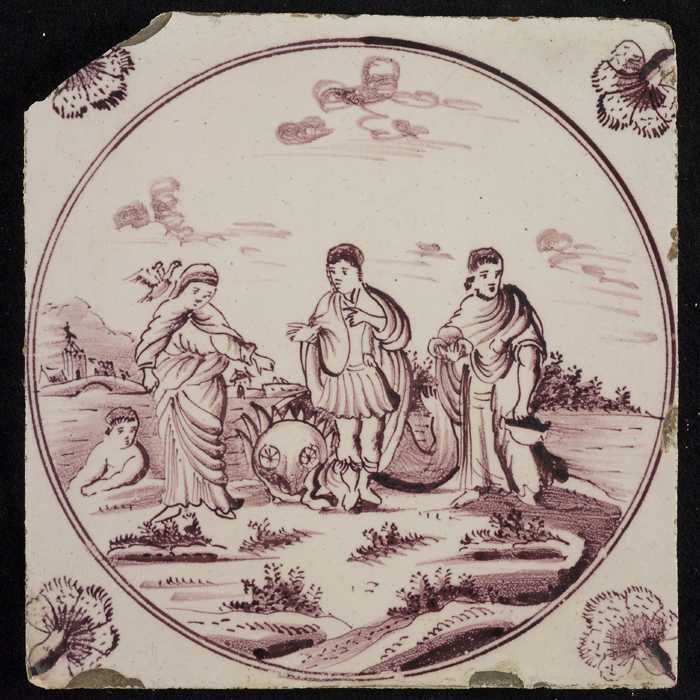 Tafereeltegel, herder en herderin met schapen, hoekm...