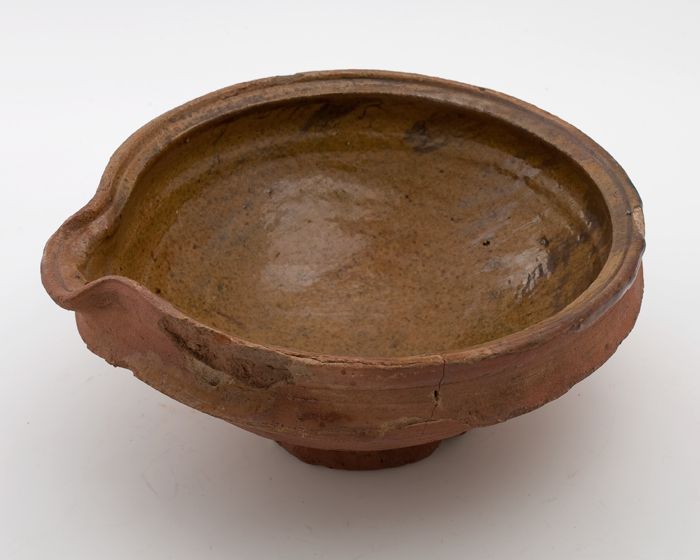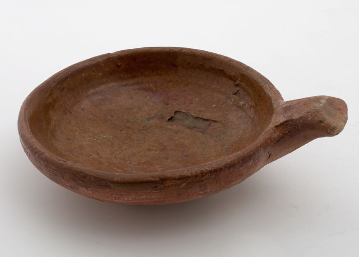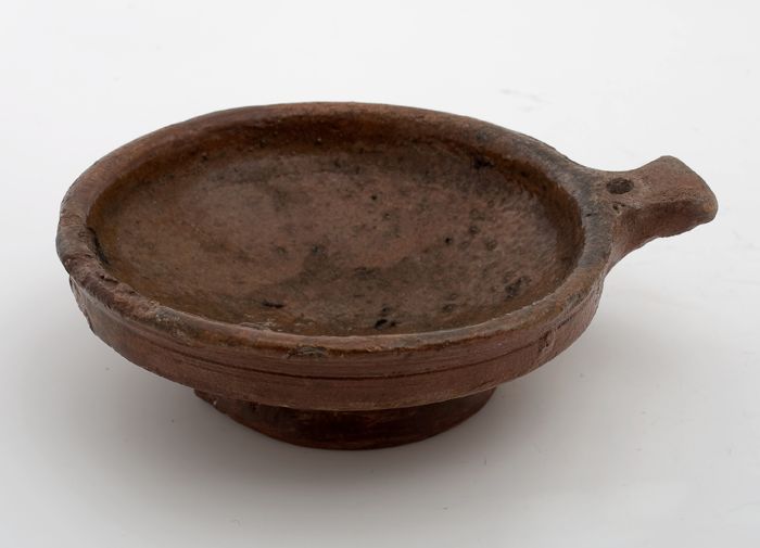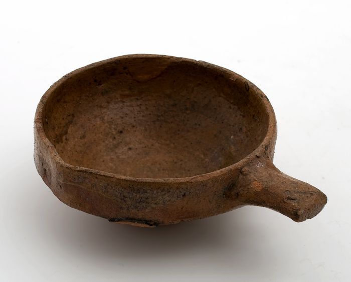 Aardewerk steelpan met brede uitstaande rand met sch...