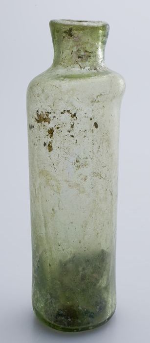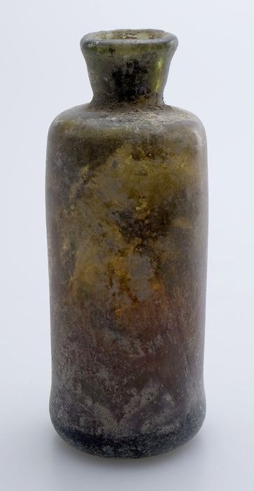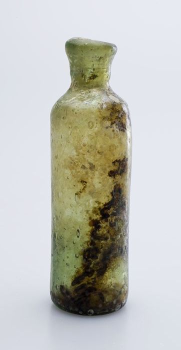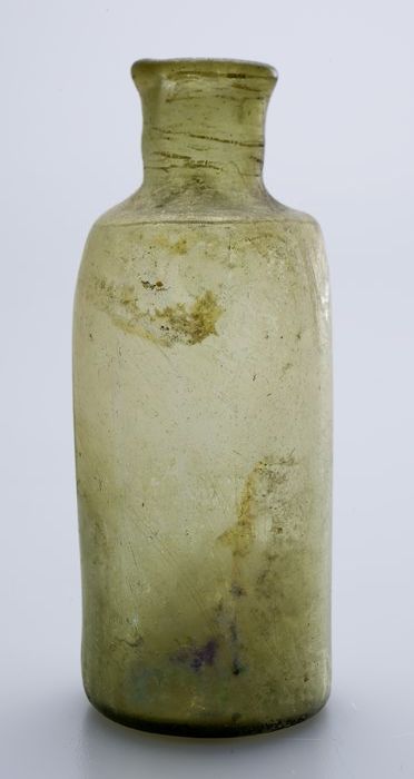 Zeer kleine buikfles met ondiepe ziel in groenig glas
