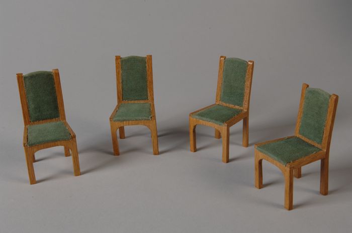 Vier eikenhouten stoelen, groene vilten bekleding op...