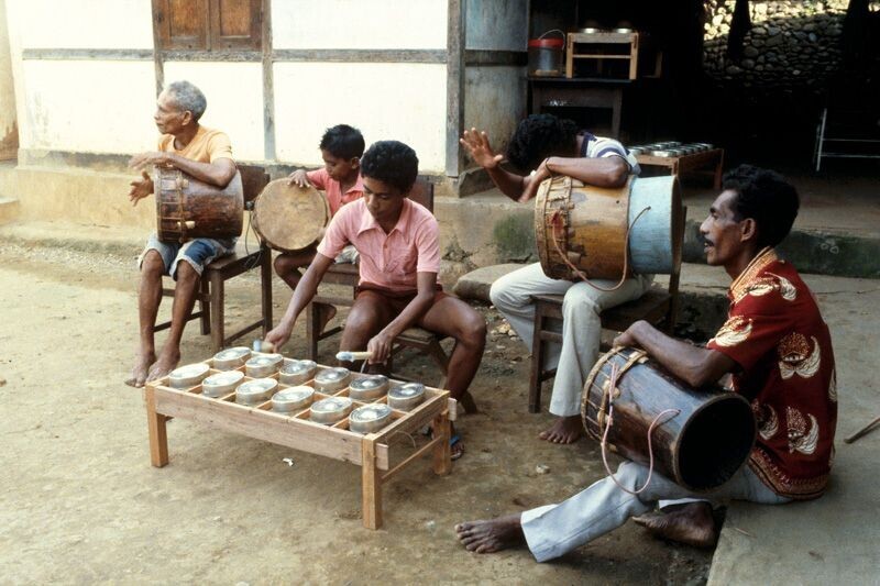 Musicians playing a totobuang and drums at Amahusu