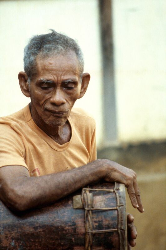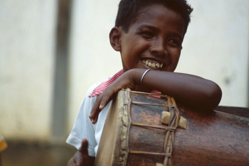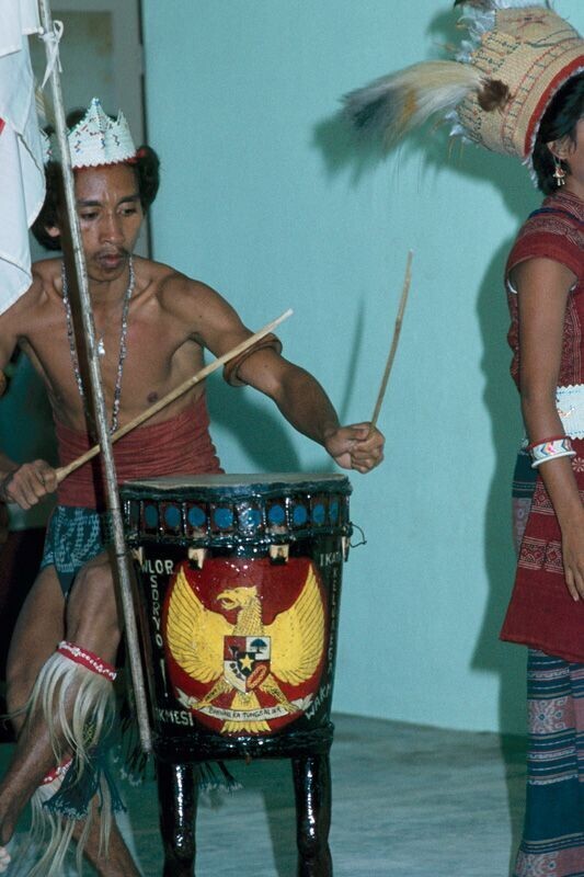 Een kleurendia van het bespelen van een trom tijdens...