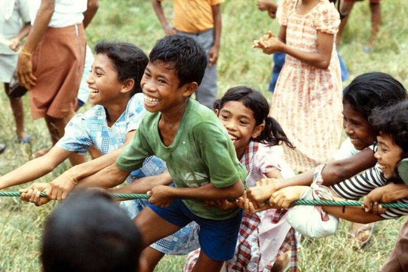 Een kleurendia van kinderen tijdens touwtrekwedstrij...