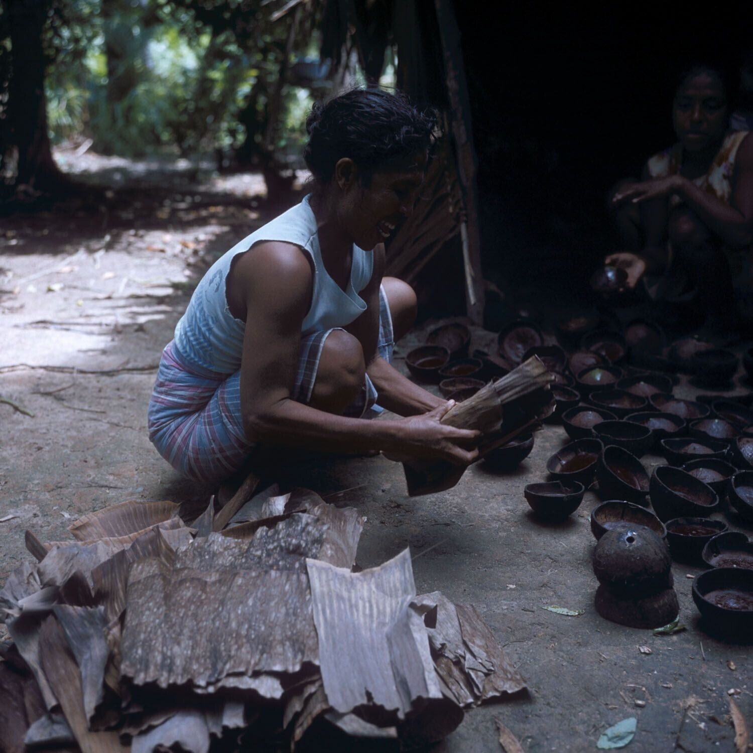 Woman packing palm sugar in dried banana leaves