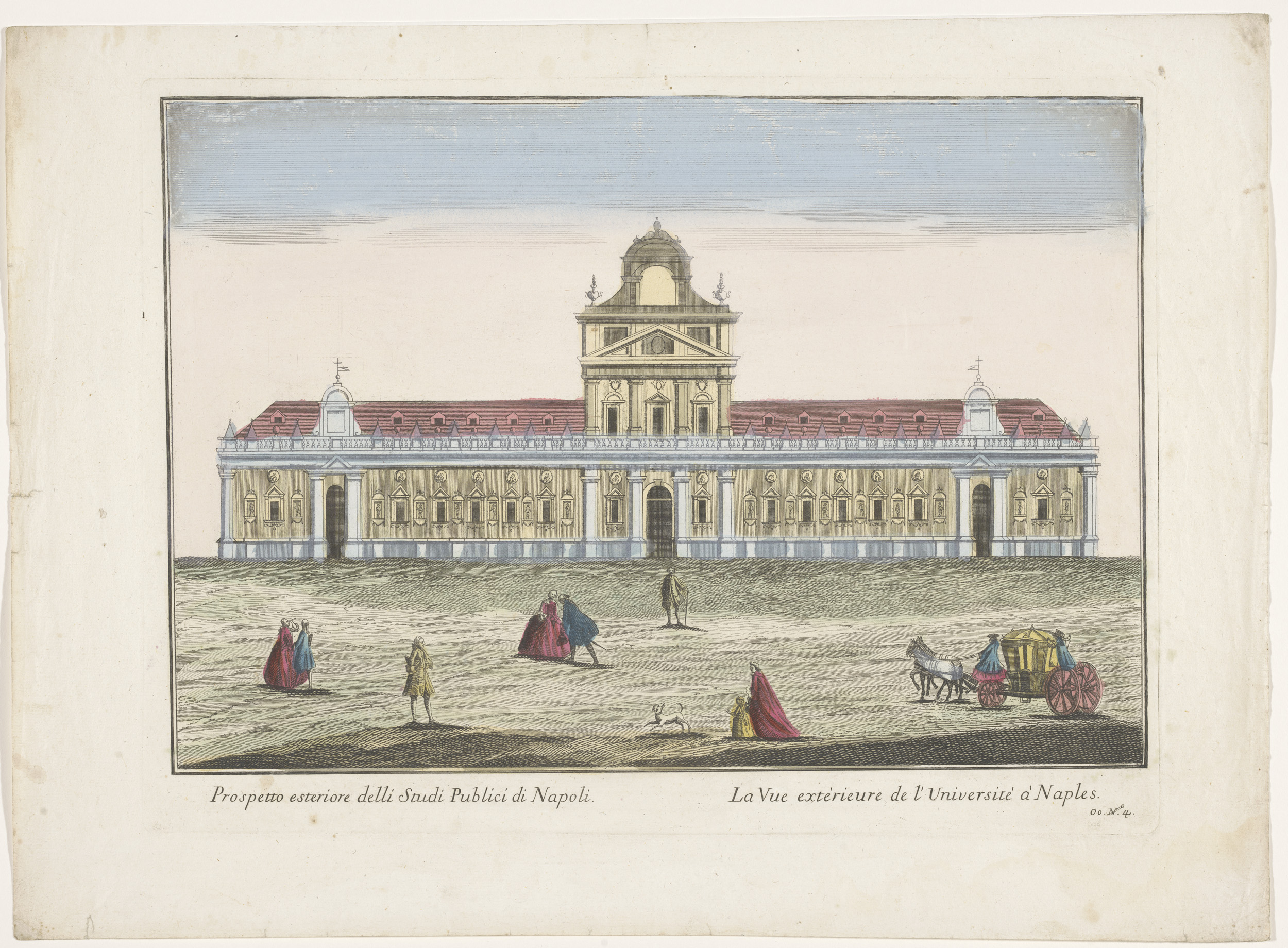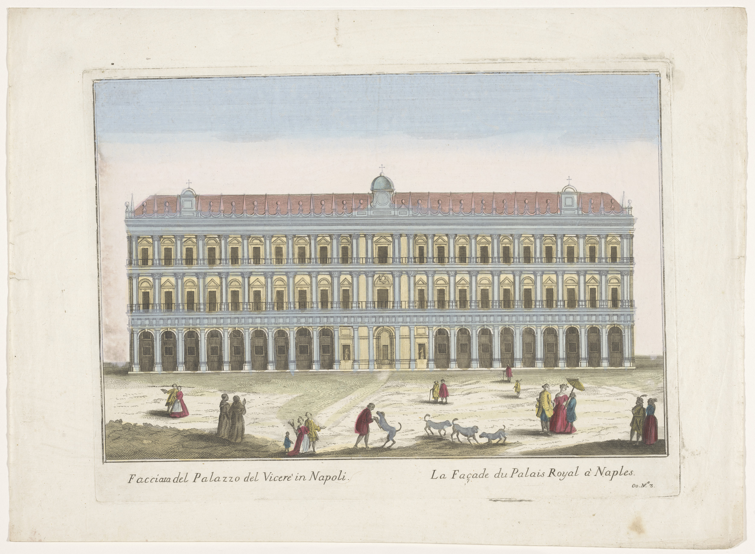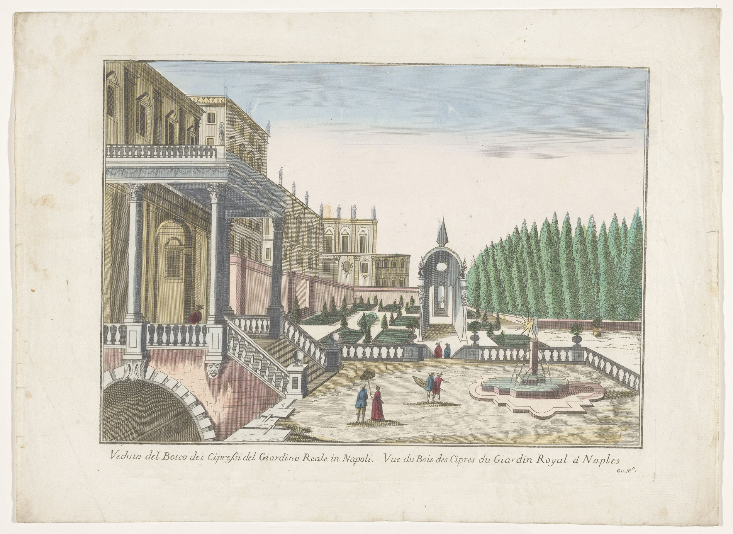 Gezicht op een tuin en een koninklijk paleis te Napels