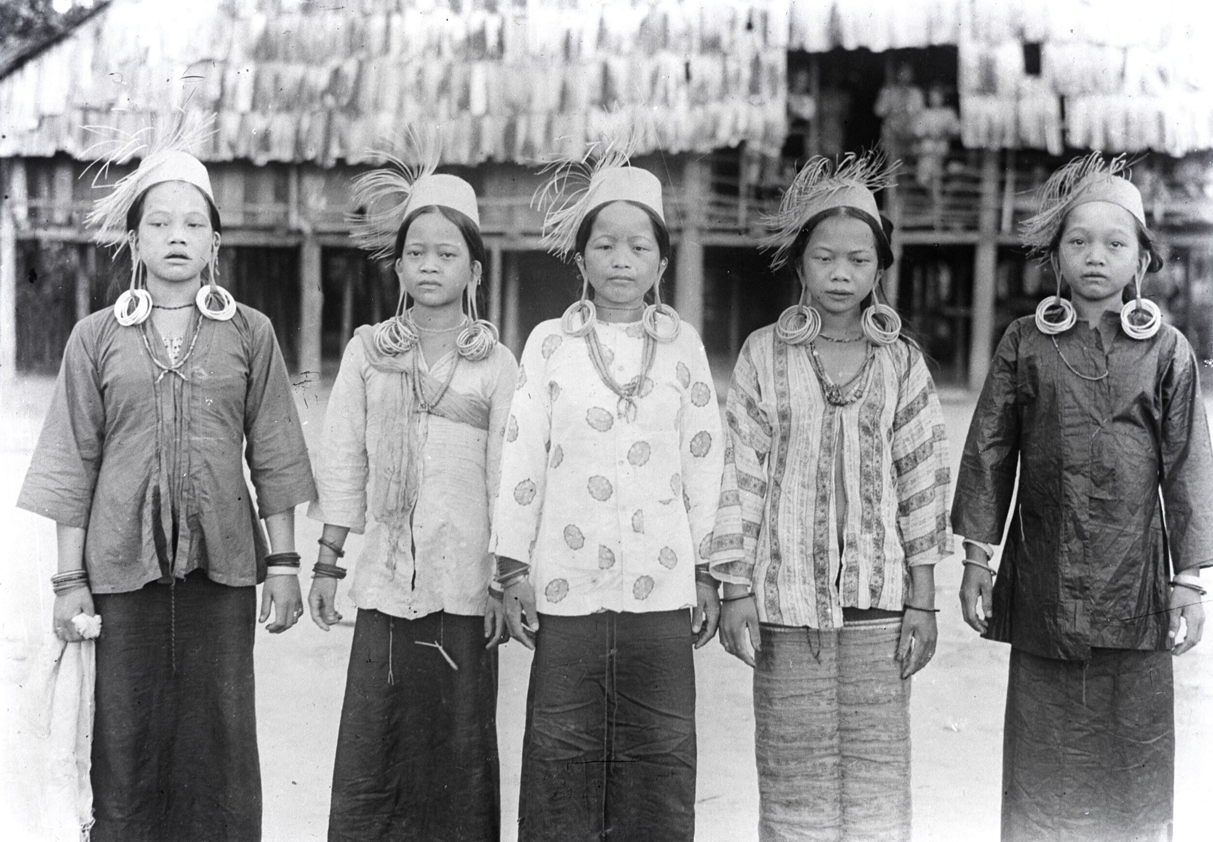 Jonge Kayan vrouwen in huiskleding, Midden-Oost-Borneo