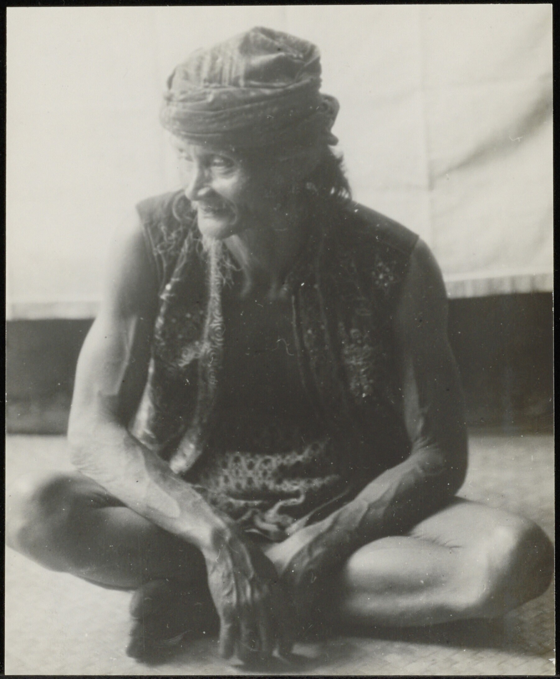 Portret van een Dayak met hoofddoek en opengedragen ...