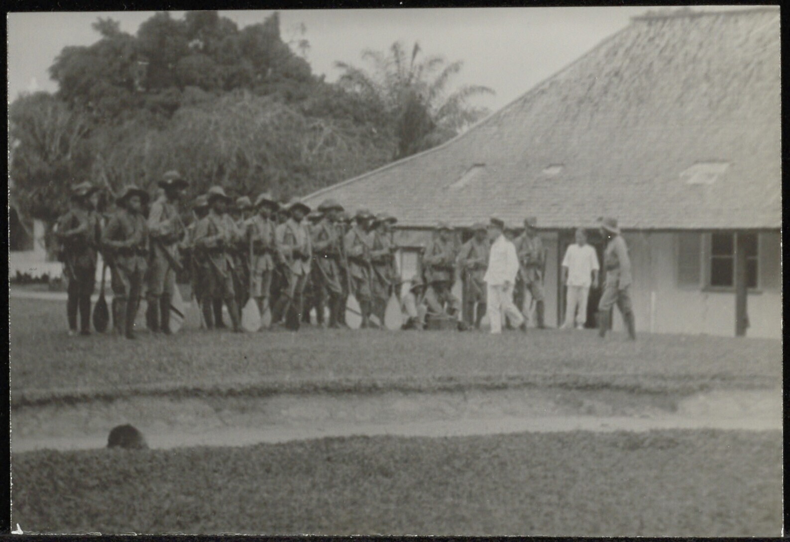 Inspectie en africhten van fuseliers bij het KNIL