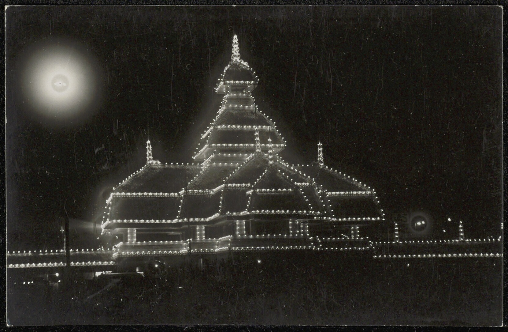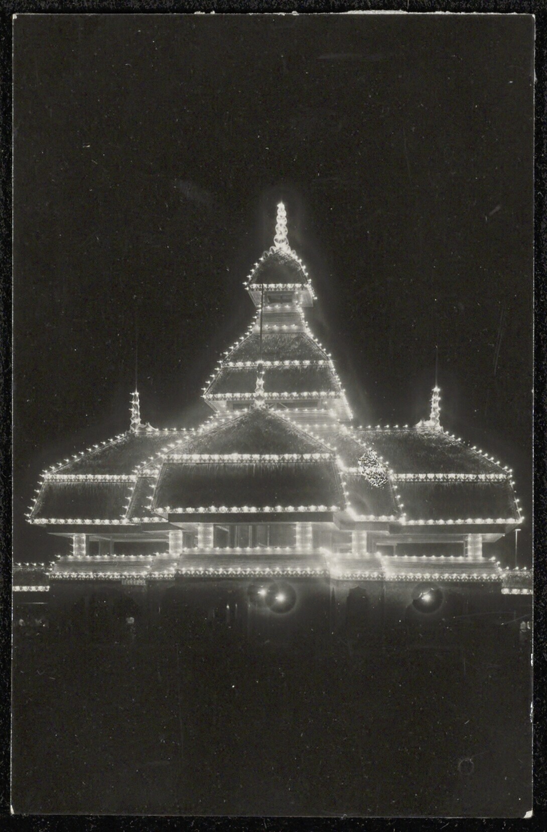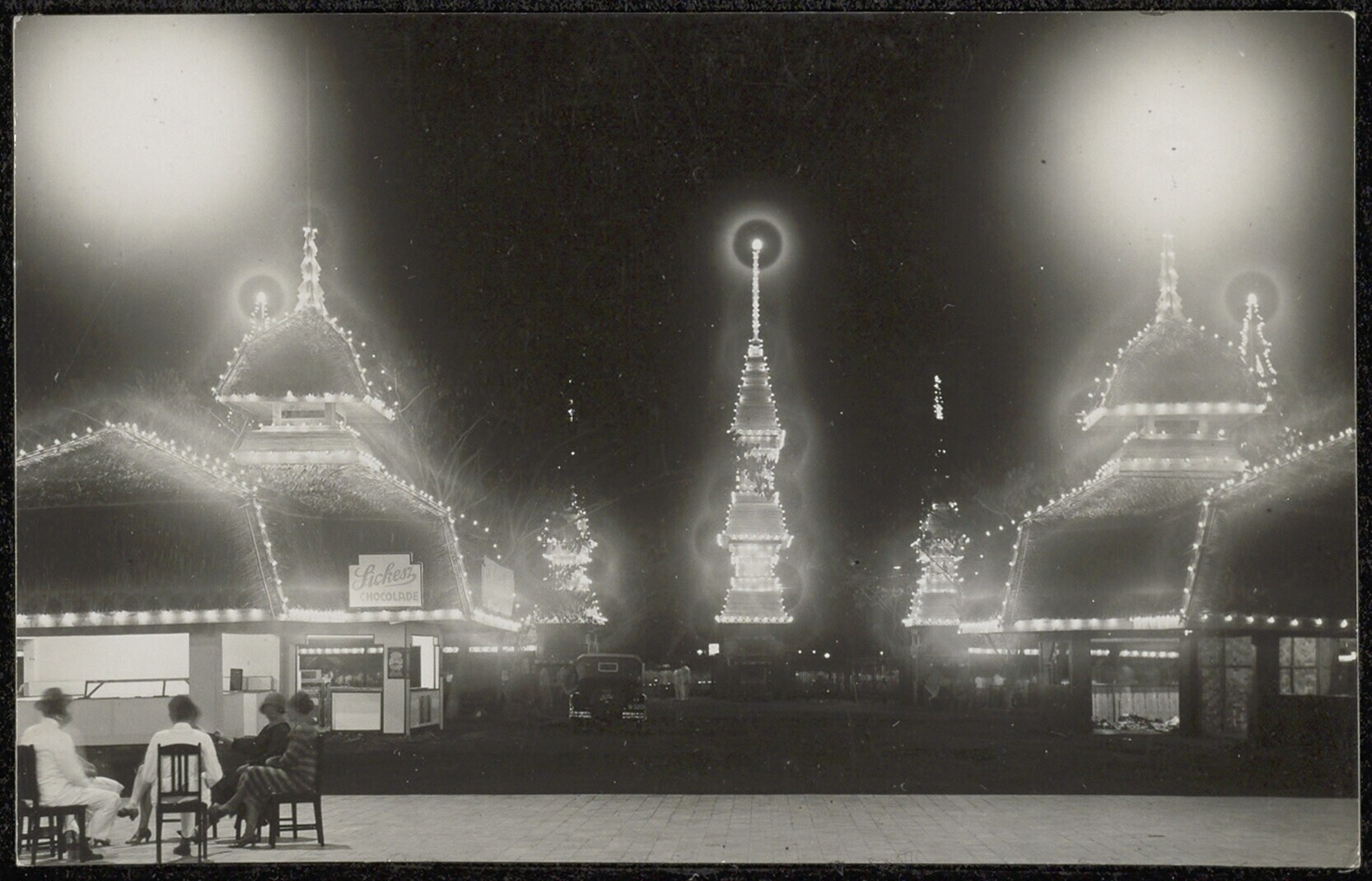 De 's avonds verlichte paviljoens op de Pasar Gambir...