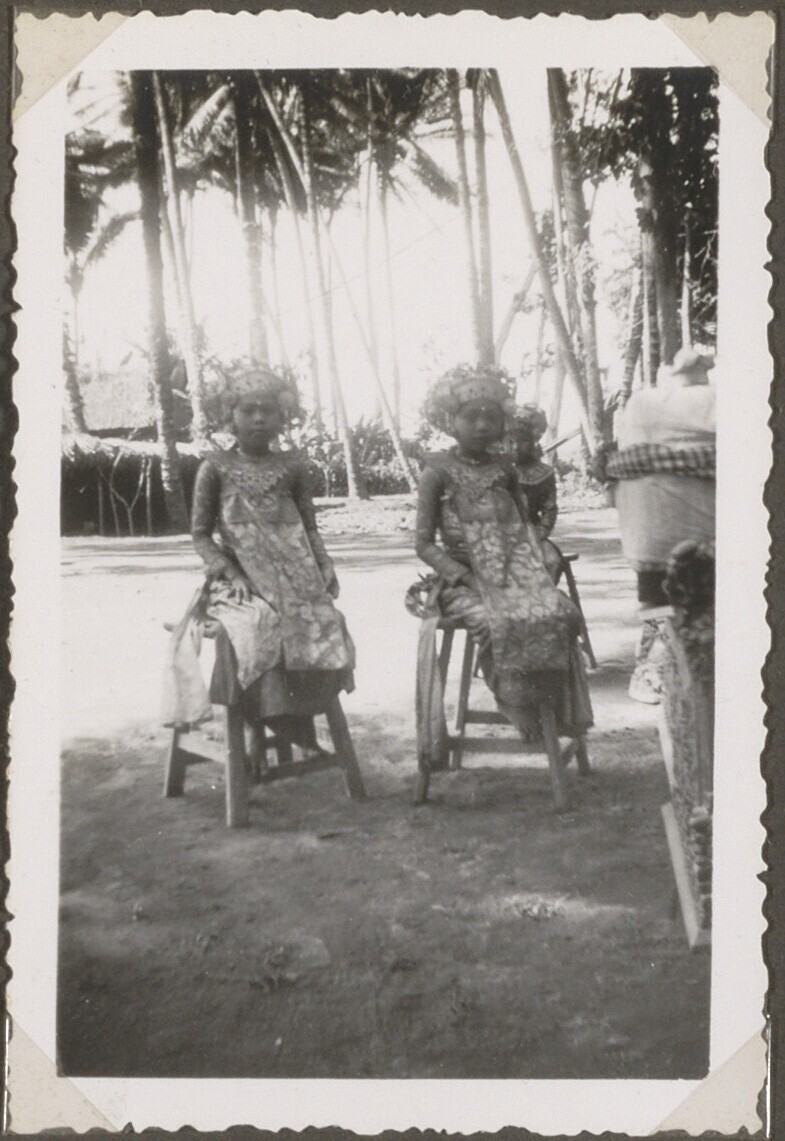 Portret van Balinese danseresjes zittend op een stoel