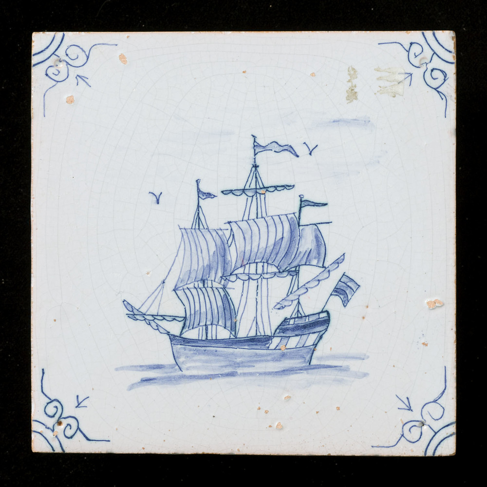 Tegel in tinglazuur, voorstellende Driemaster, repro...