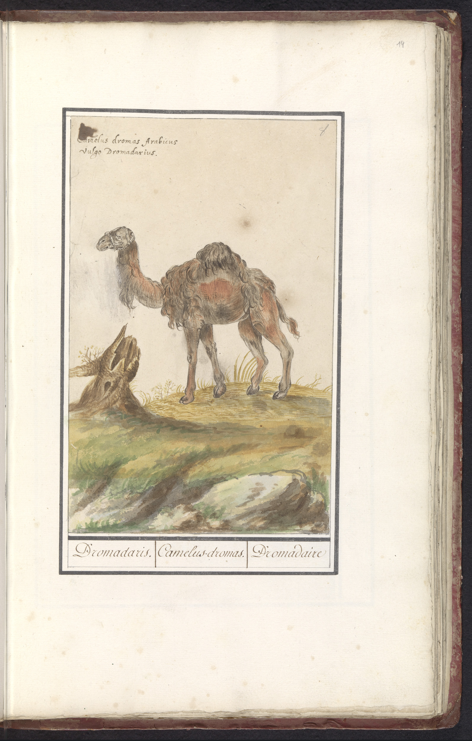 Kameel (Camelus ferus bactrianus) en giraffe (Giraffa)