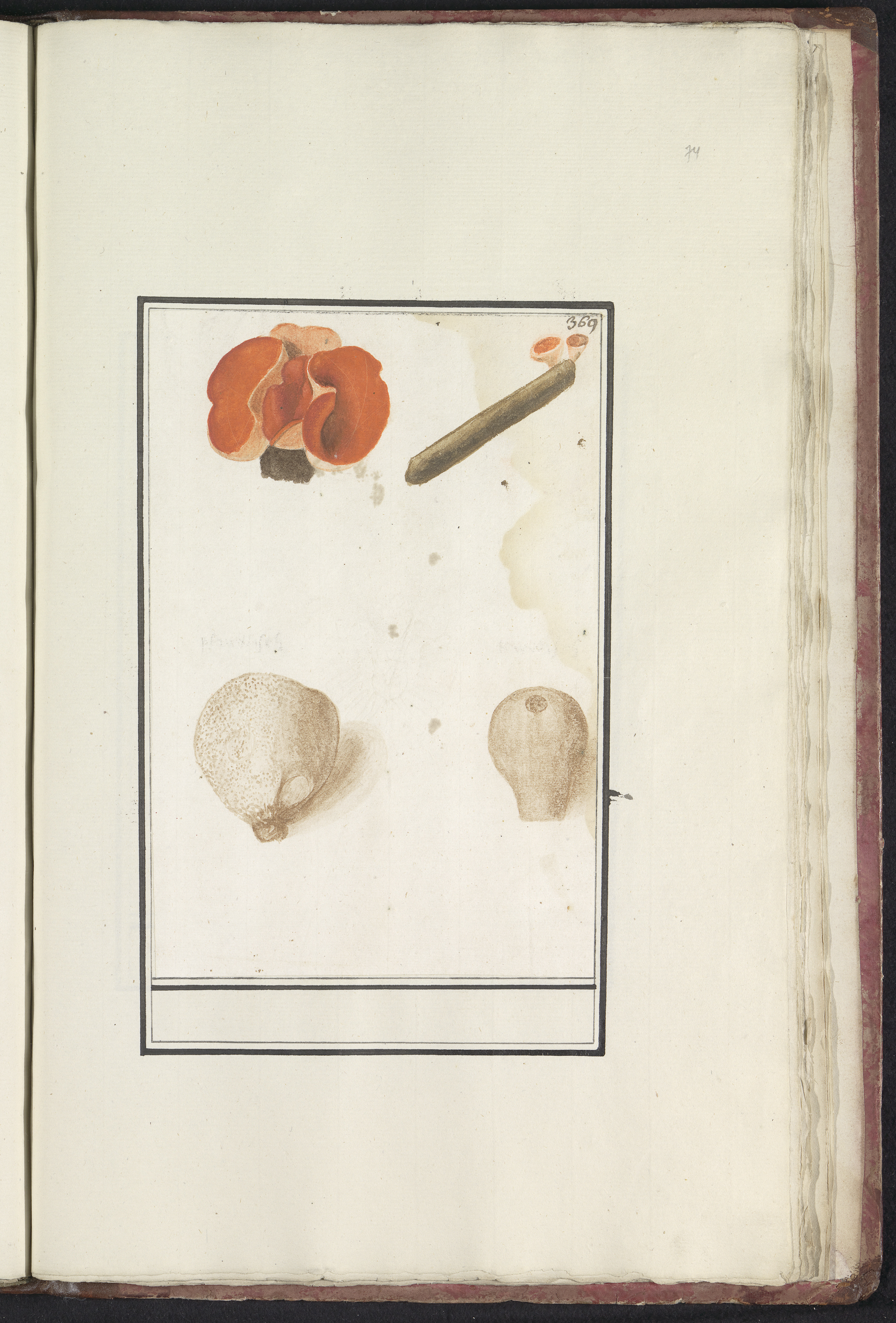 Bovist (Bovista) en rode bekerzwam (Sarcoscypha cocc...