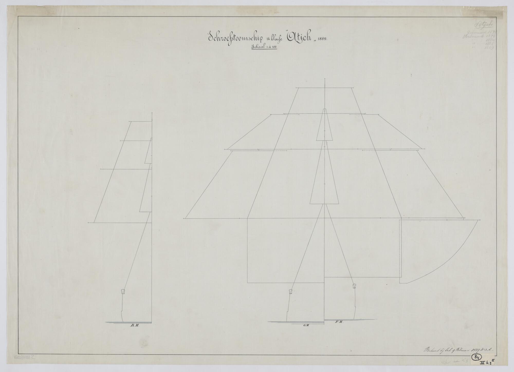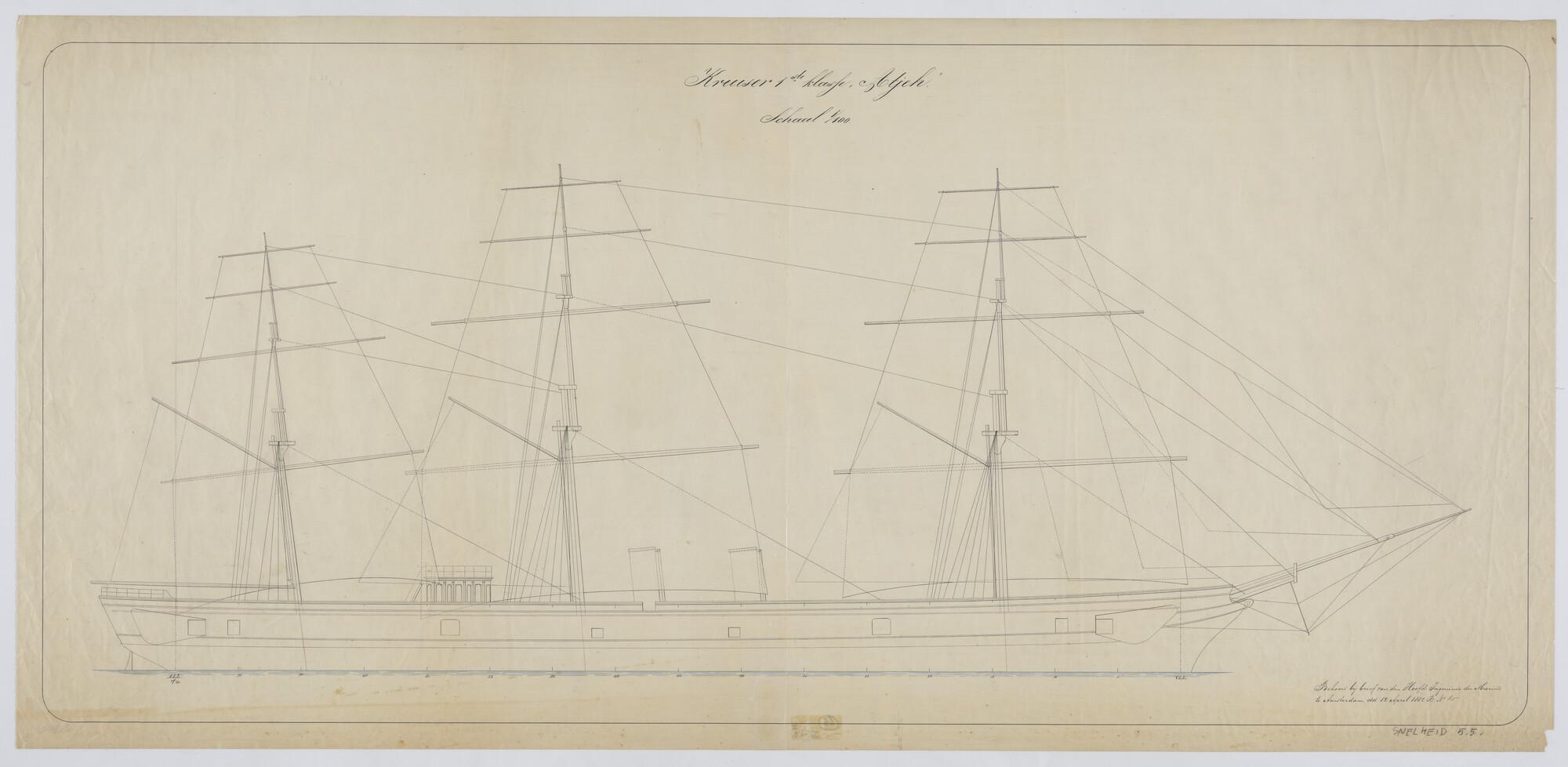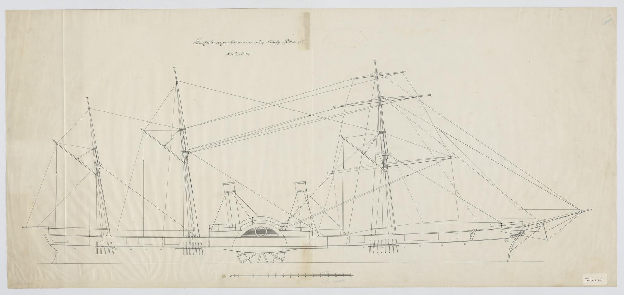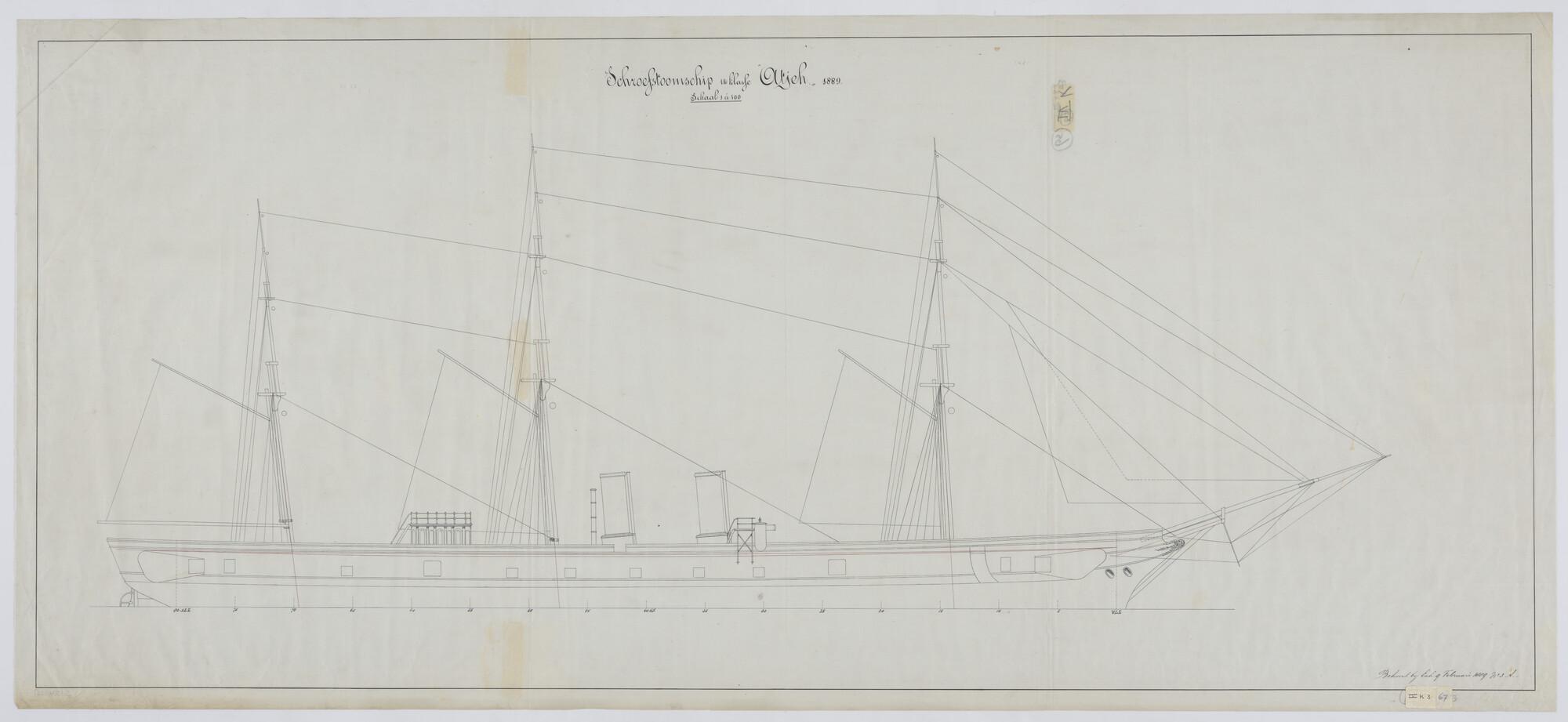 Zijaanzicht met tuigplan van het schroefstoomschip 3...