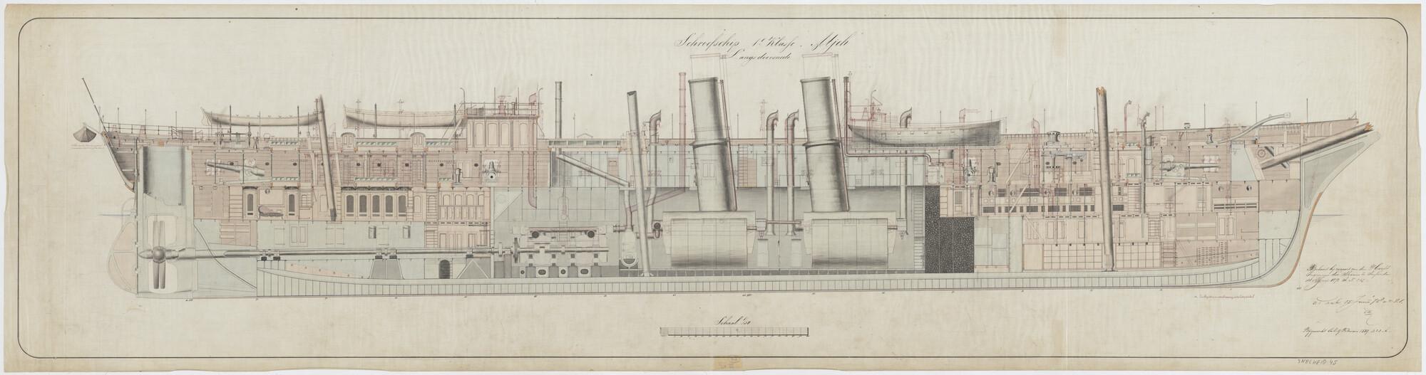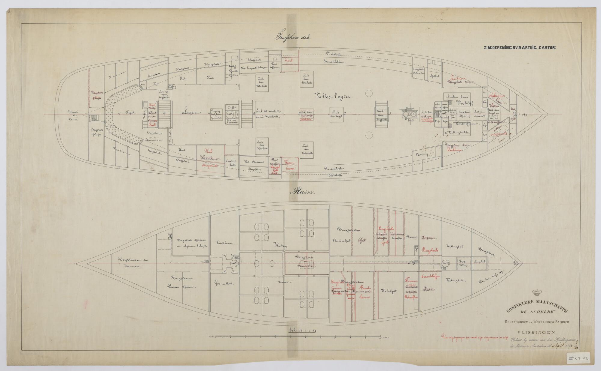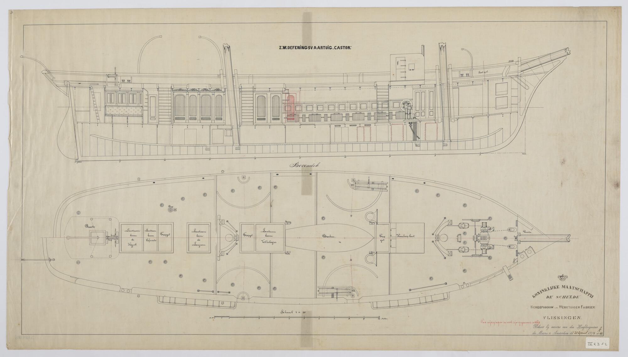 De brik Zr.Ms. 'Castor', 1878. verticale langsdoorsn...