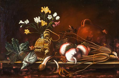 Stilleven met bloemen en groenten