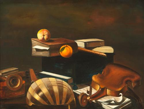 Stilleven met muziekinstrumenten, boeken en fruit
