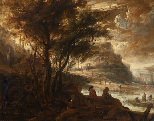 Berglandschap met figuren aan een oever