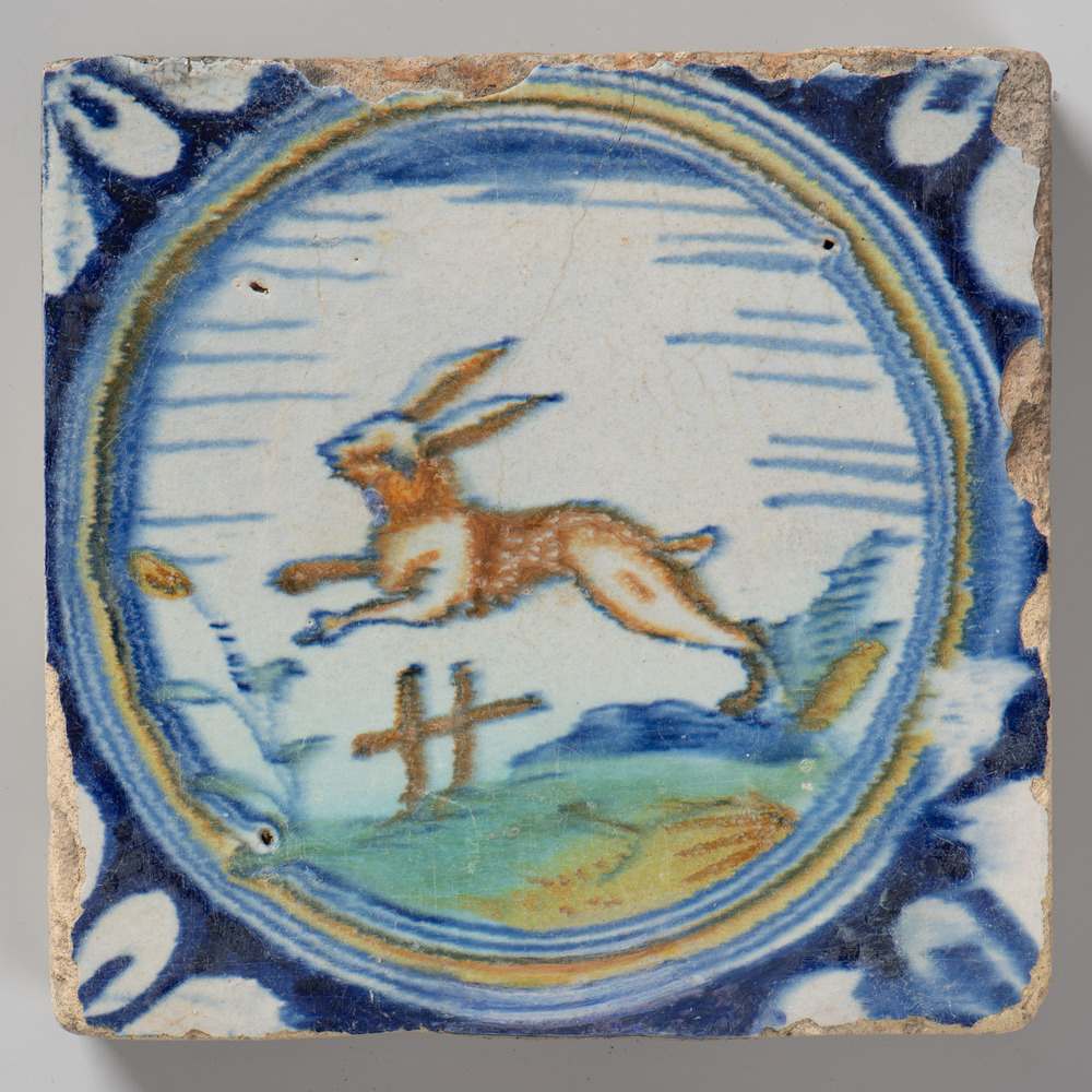 tegel van keramiek met tinglazuur, voorstellende: ha...