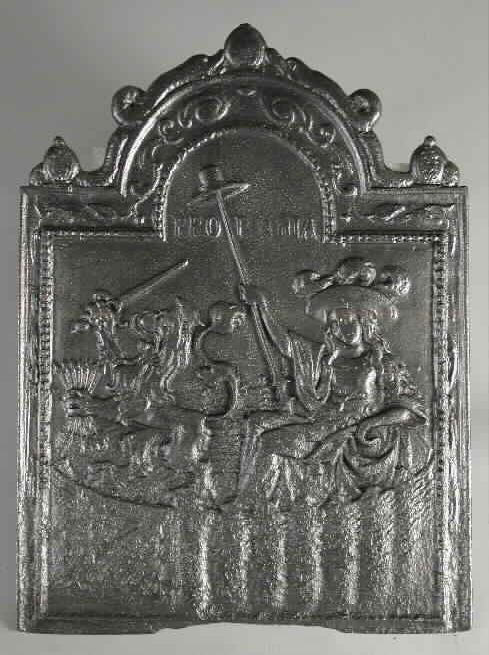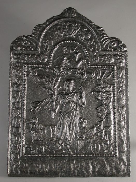 Haardplaat vrouwenfiguur Vrede, jaartal "1679", "PAX"