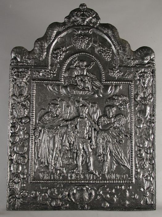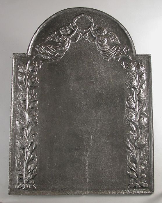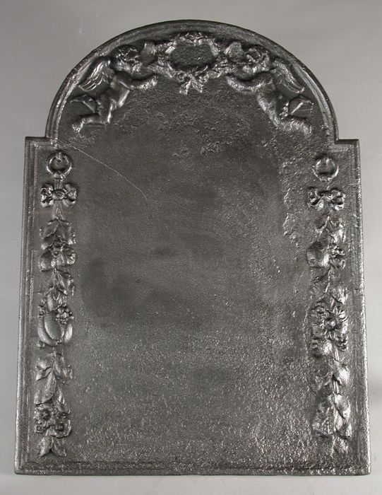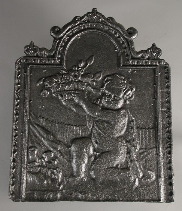 Haardplaat met engelen, lauwerkrans en tulpen