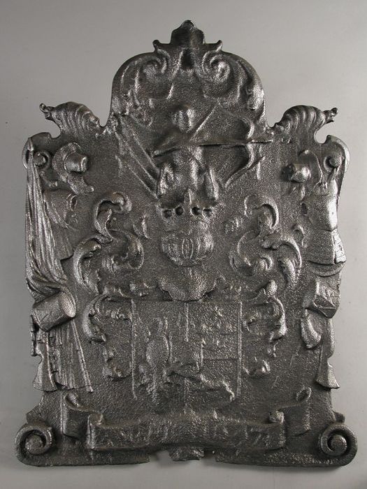 Haardplaat met gekroond wapenschild, centaur en lint...