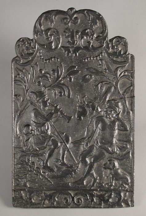 Haardplaat met fluitspelende Mercurius, rustende man...