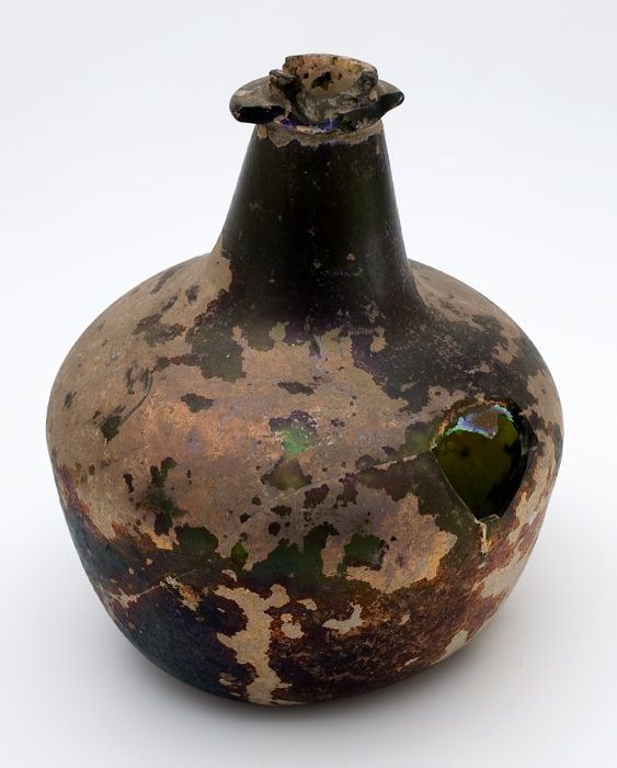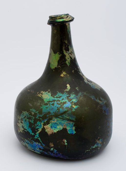 Rondbuikige fles in olijfgroen glas, aangetast en ge...