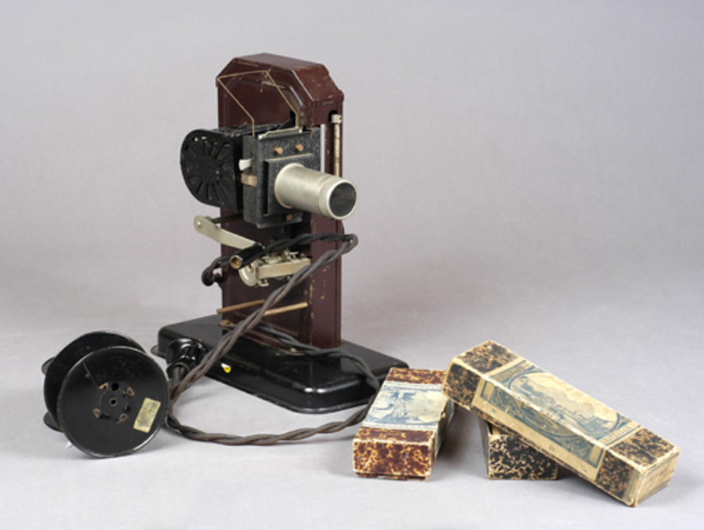 metalen filmprojector & toverlantaarn met film en to...