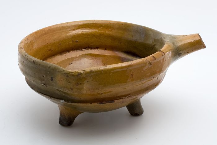 Aardewerk steelpan, rode scherf, geheel geglazuurd, ...