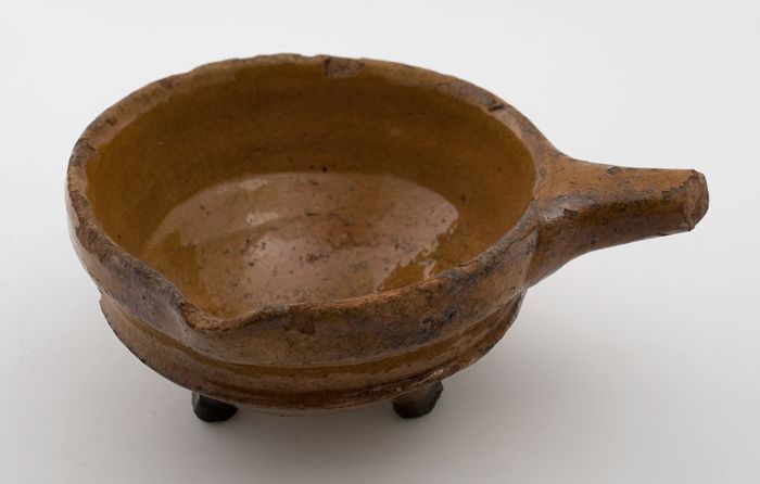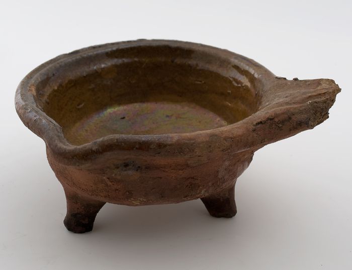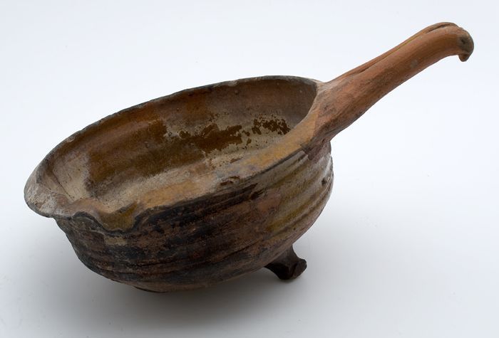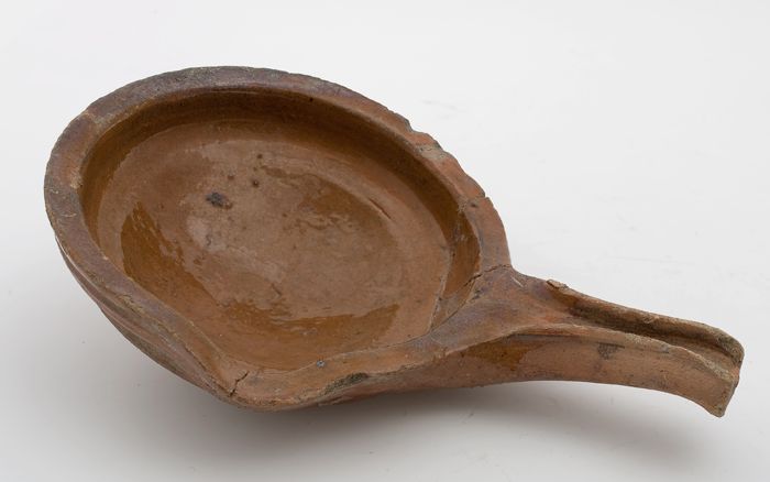 Aardewerk steelpan, rode scherf met loodglazuur, mon...