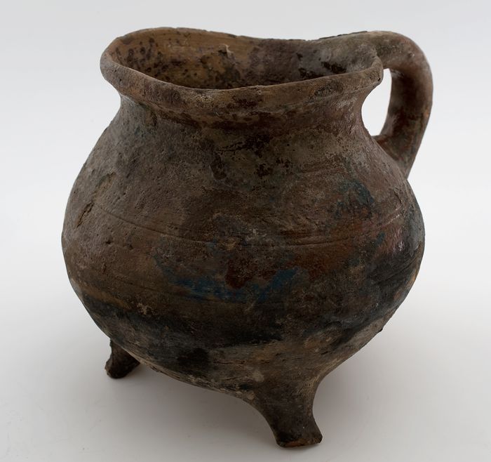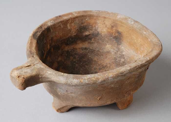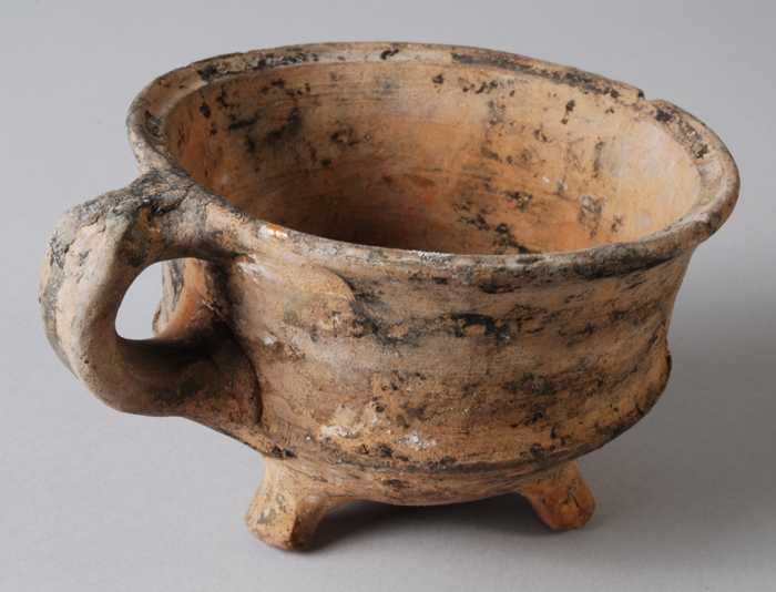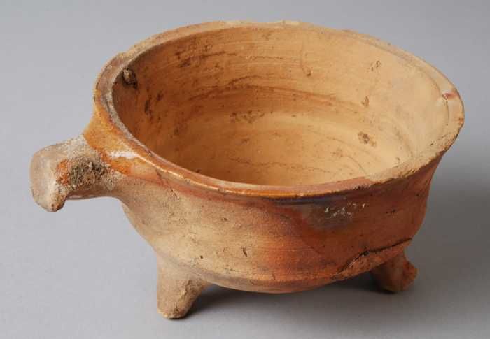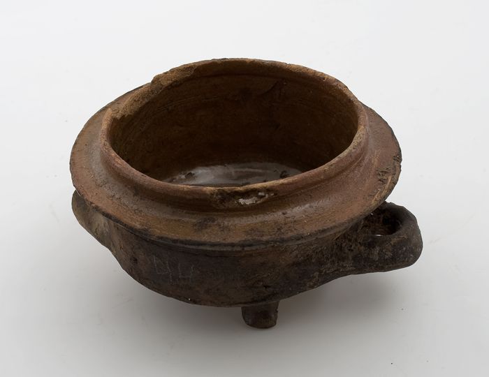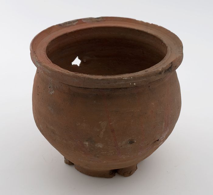 Aardewerk kookkan van rood aardewerk, buik op drie p...