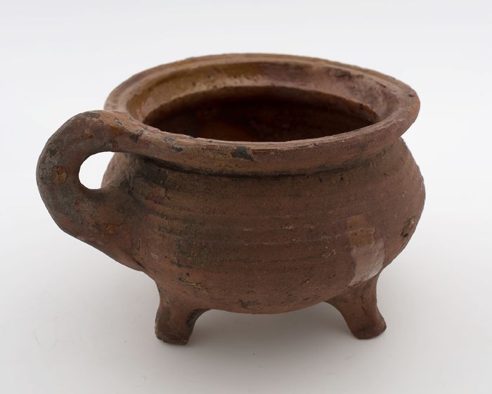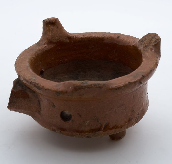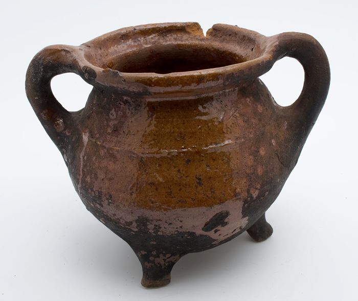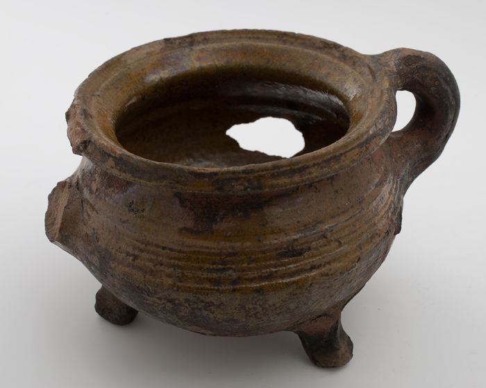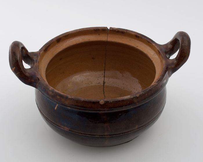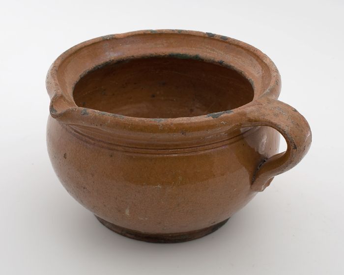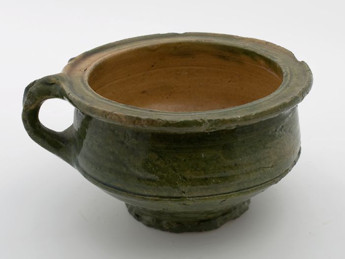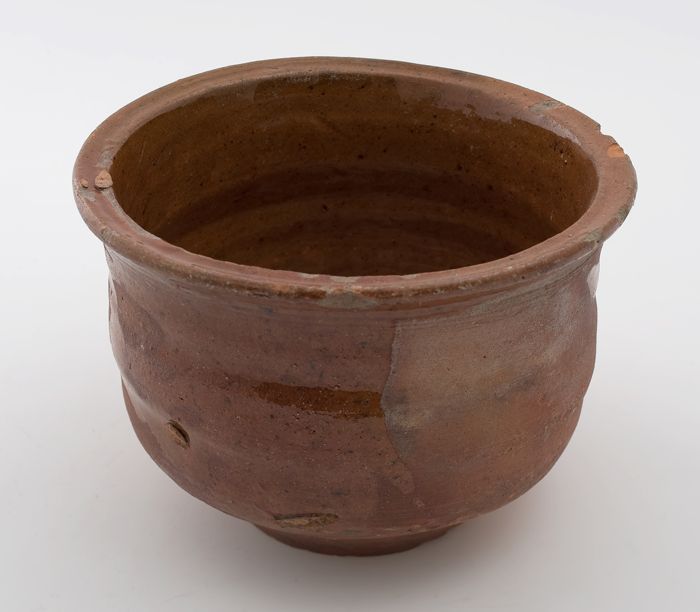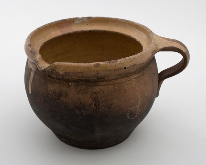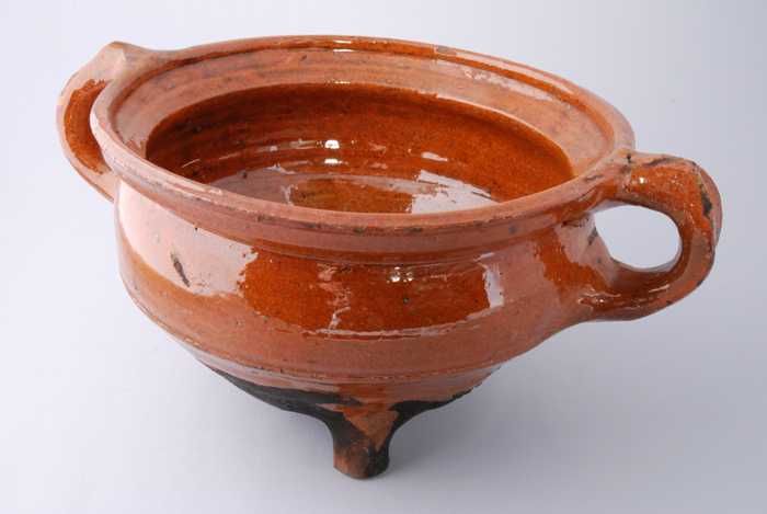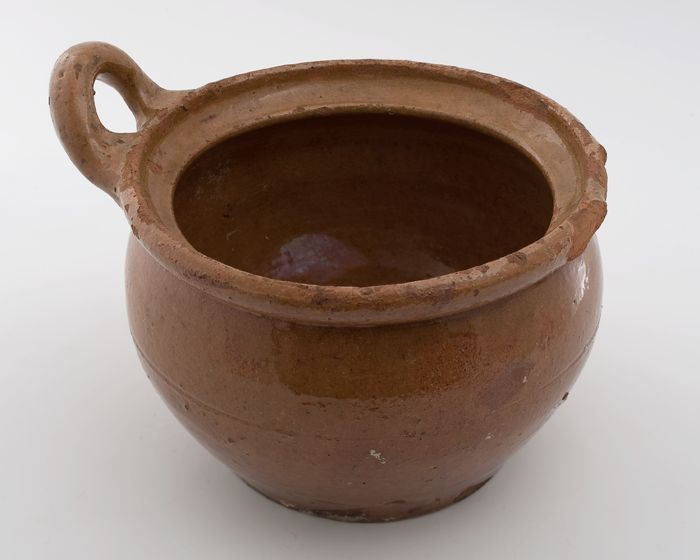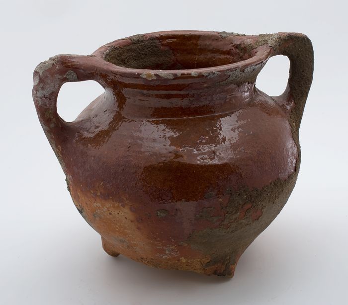 Aardewerk kookpot, rode scherf, bedekt met loodglazu...