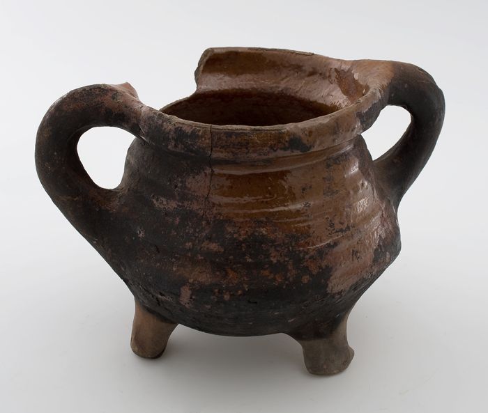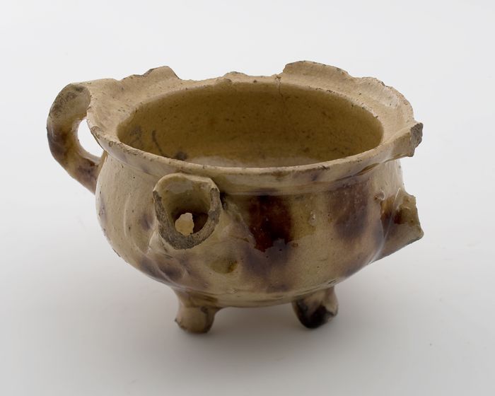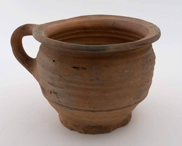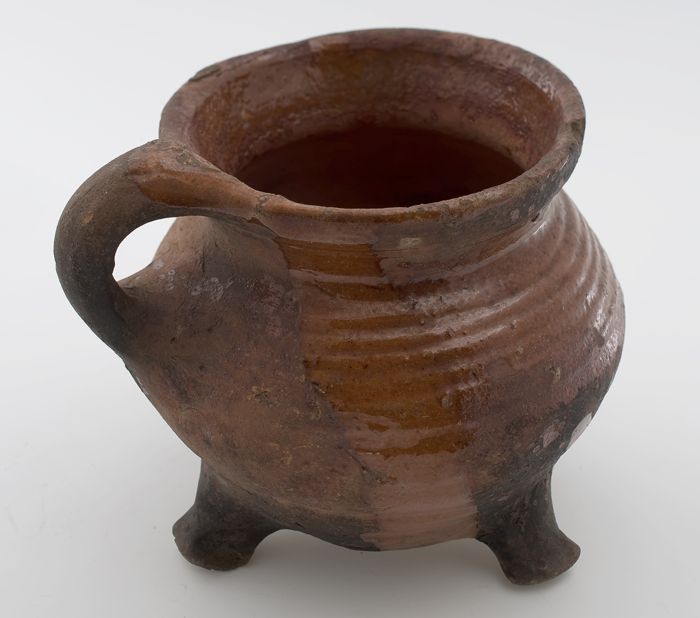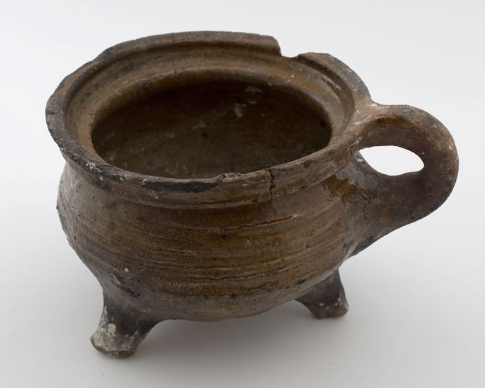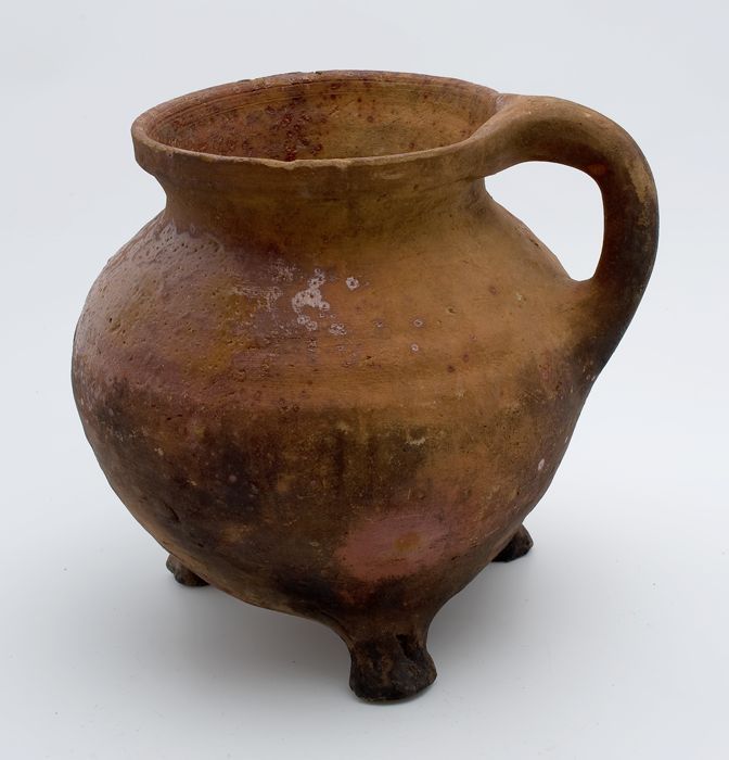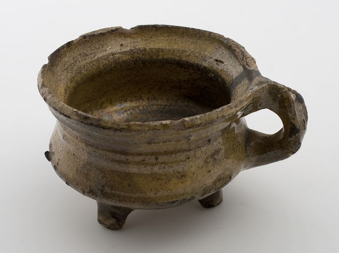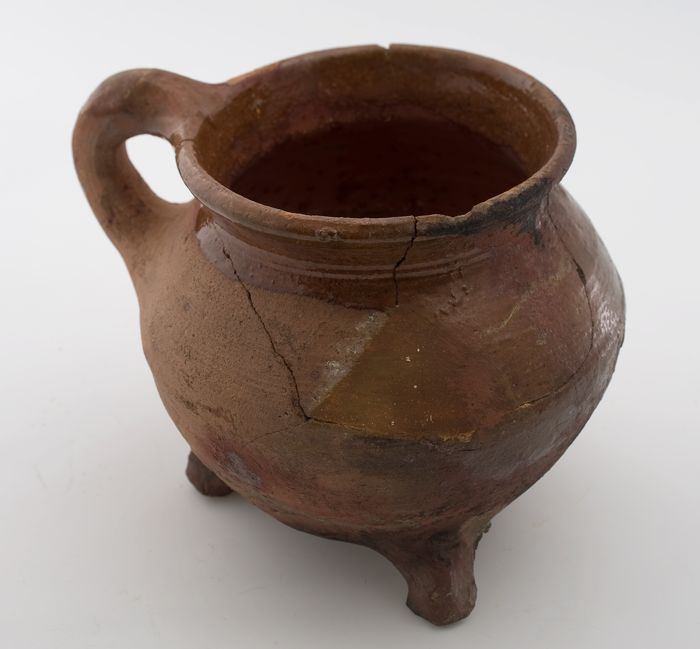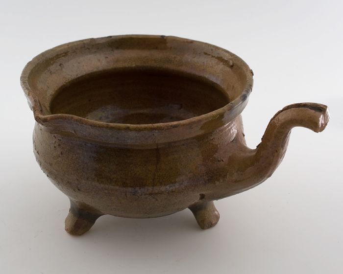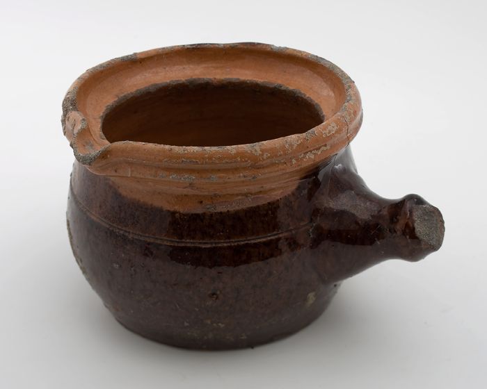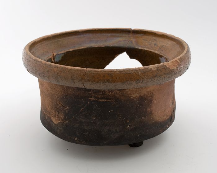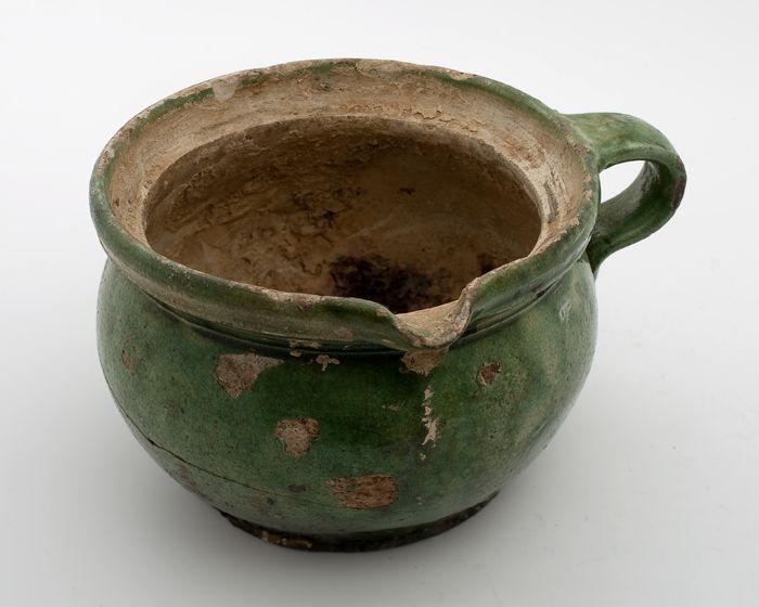 Aardewerk kookpot, rode scherf, bedekt met loodglazu...