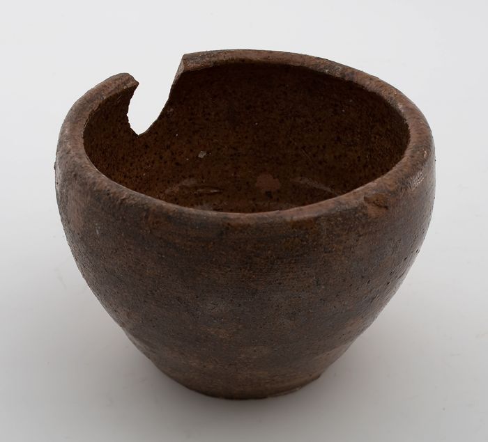 Aardewerk papkom, rode scherf, geheel bedekt met loo...