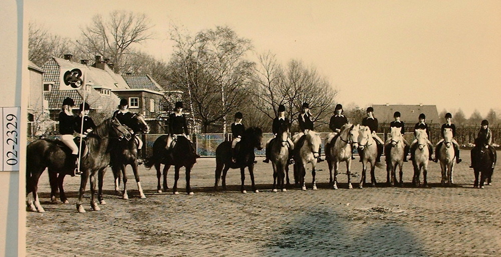 Groepen paardrijsters met hun begeleiders