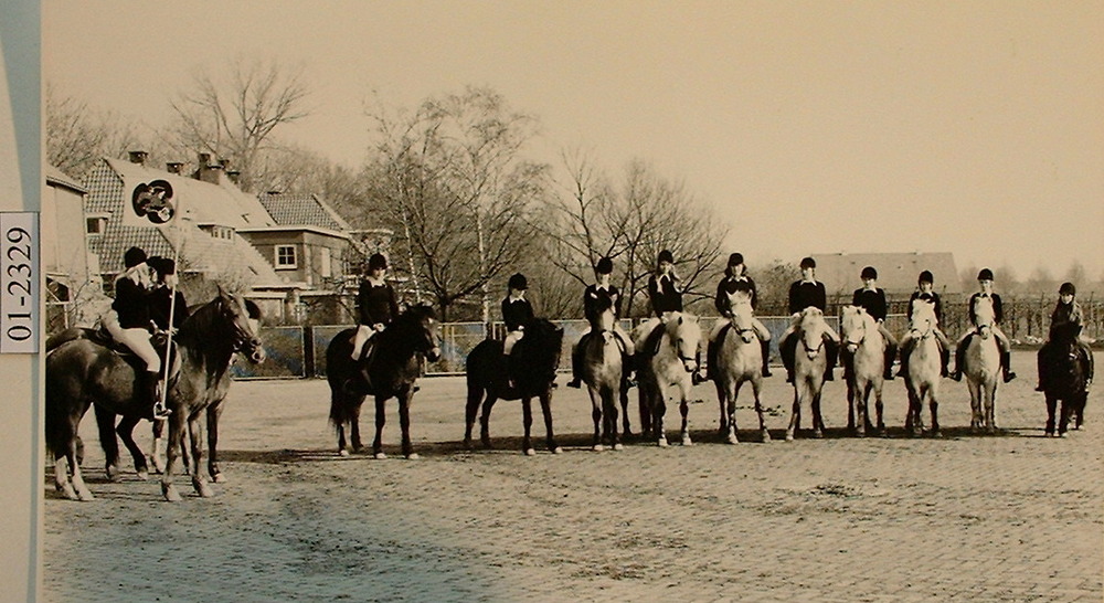 Groepen paardrijsters met hun begeleiders