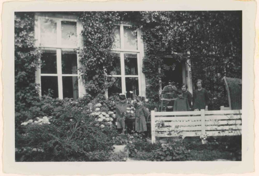 De tweeling Jan en Annie Beelen bij hun ouderlijk huis
