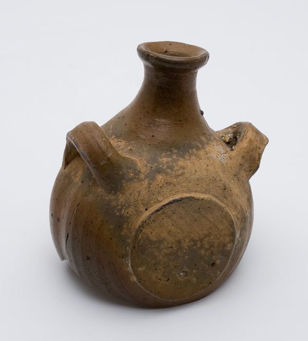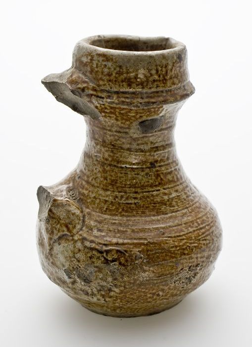 Kleine steengoed kruik met staand oor, afgesleten gl...