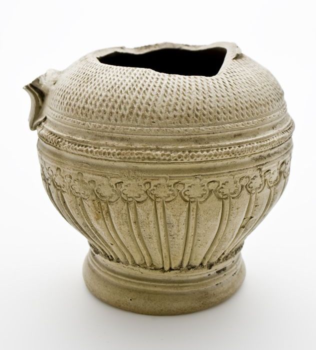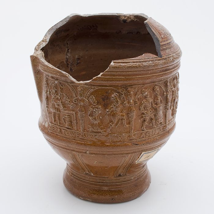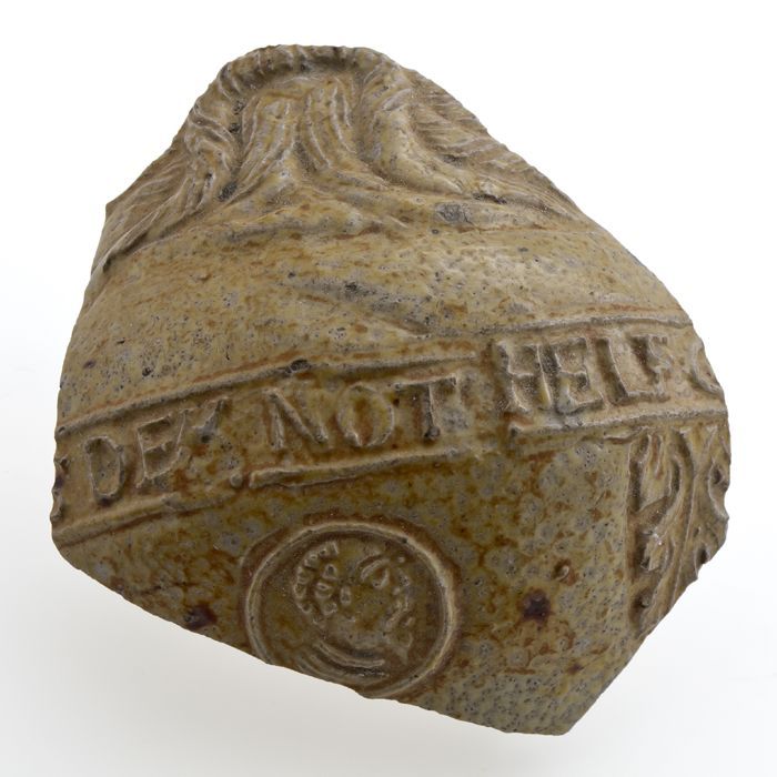 Fragment baardmankruik, fries met tekst rond buik, p...